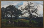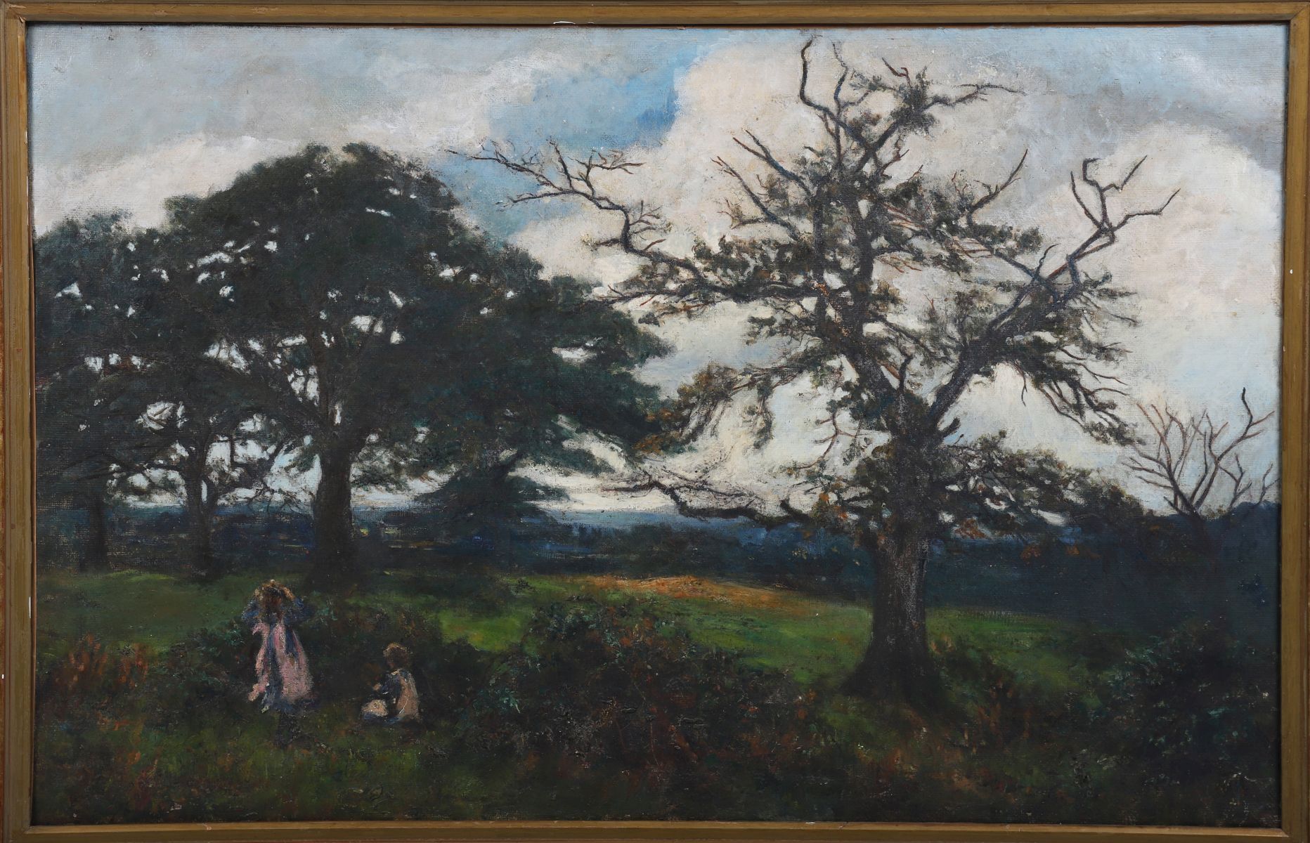 A 19th century English Impressionist School oil on canvas depicting two female figures in a pastoral landscape, seated beneath mature trees against a partly clouded sky.
