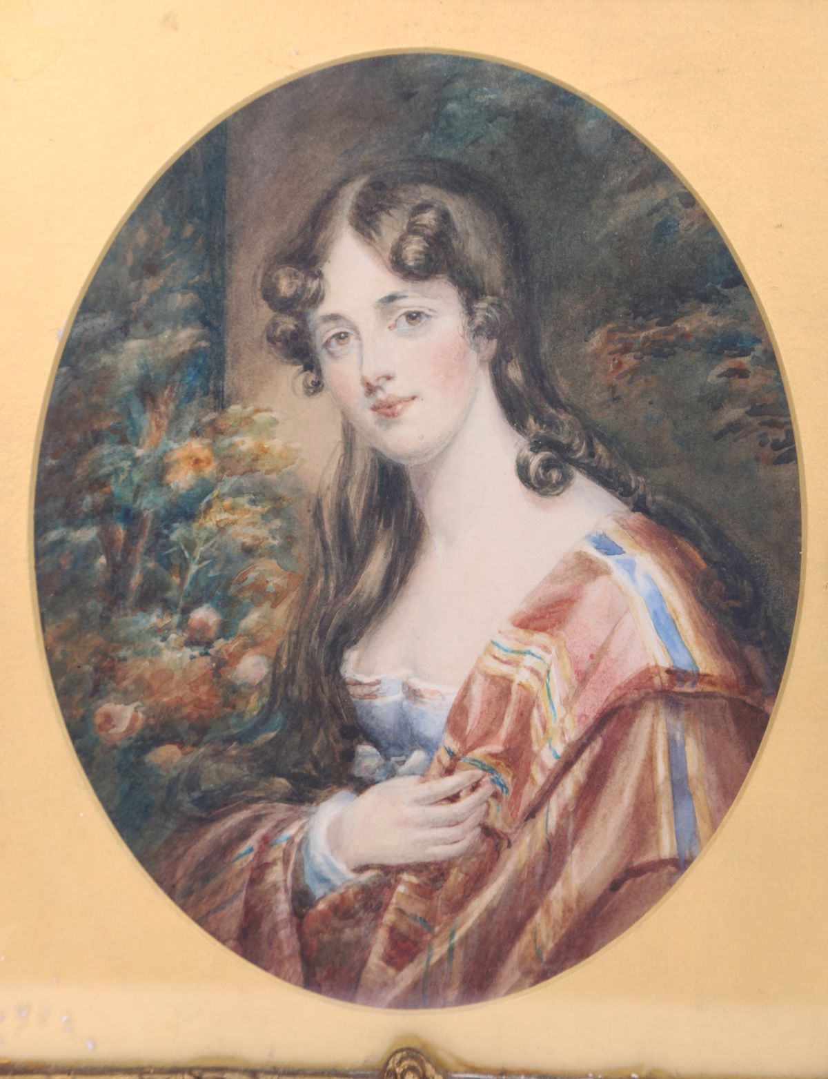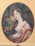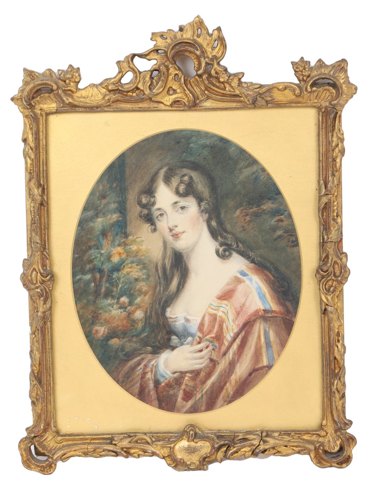 Oval watercolour portrait miniature depicting a young woman, painted in three-quarter profile, mounted within a gilt moulded frame and glazed.