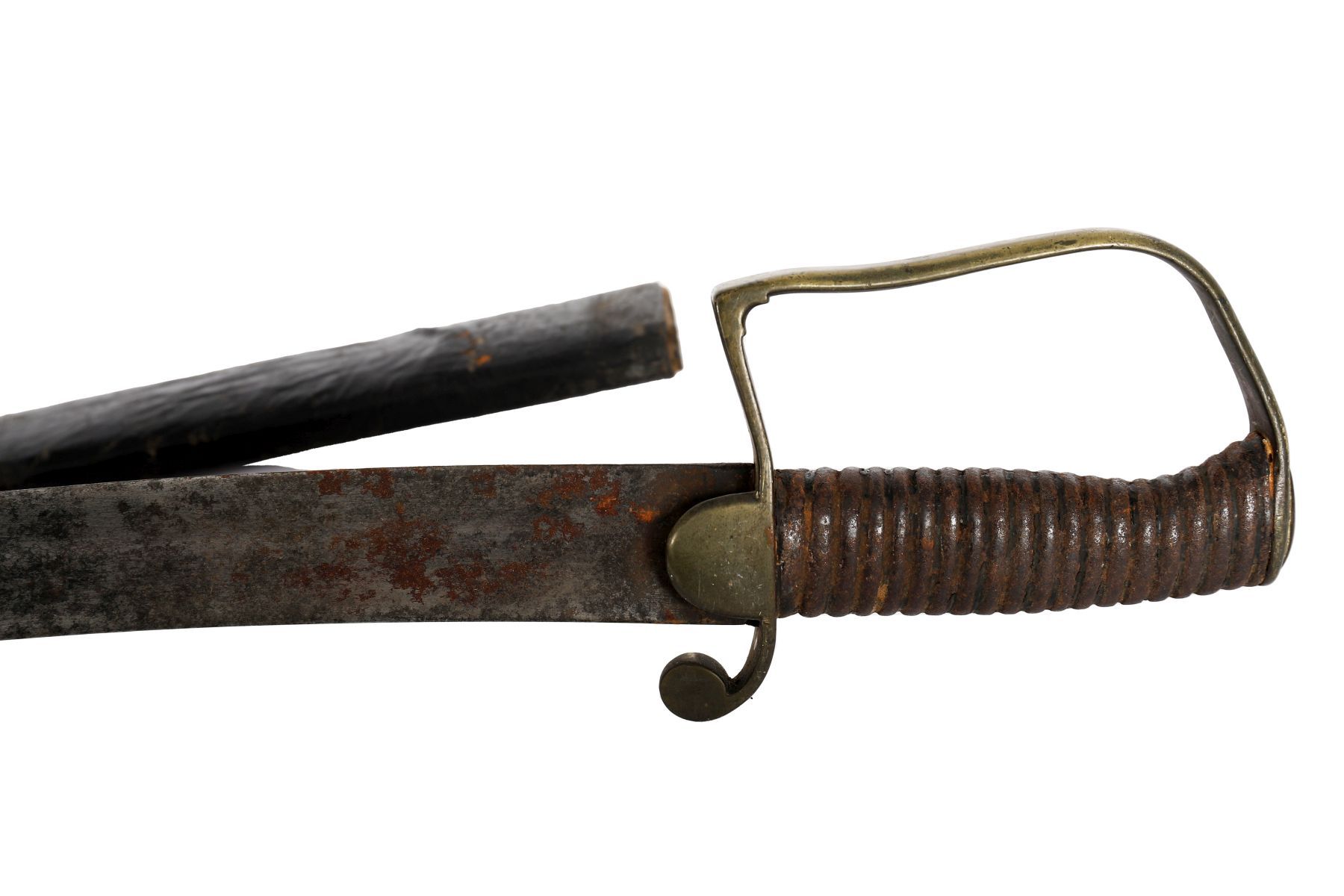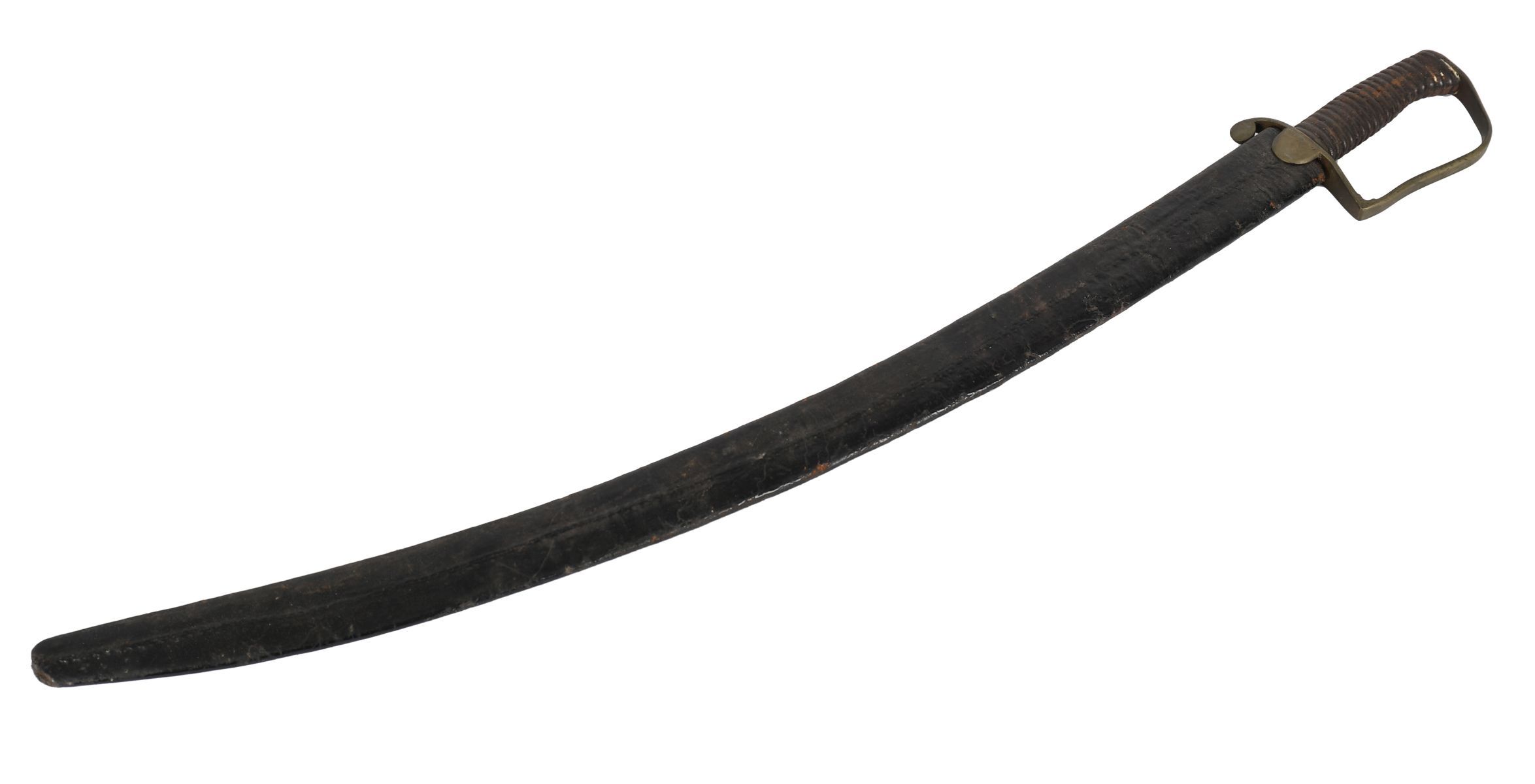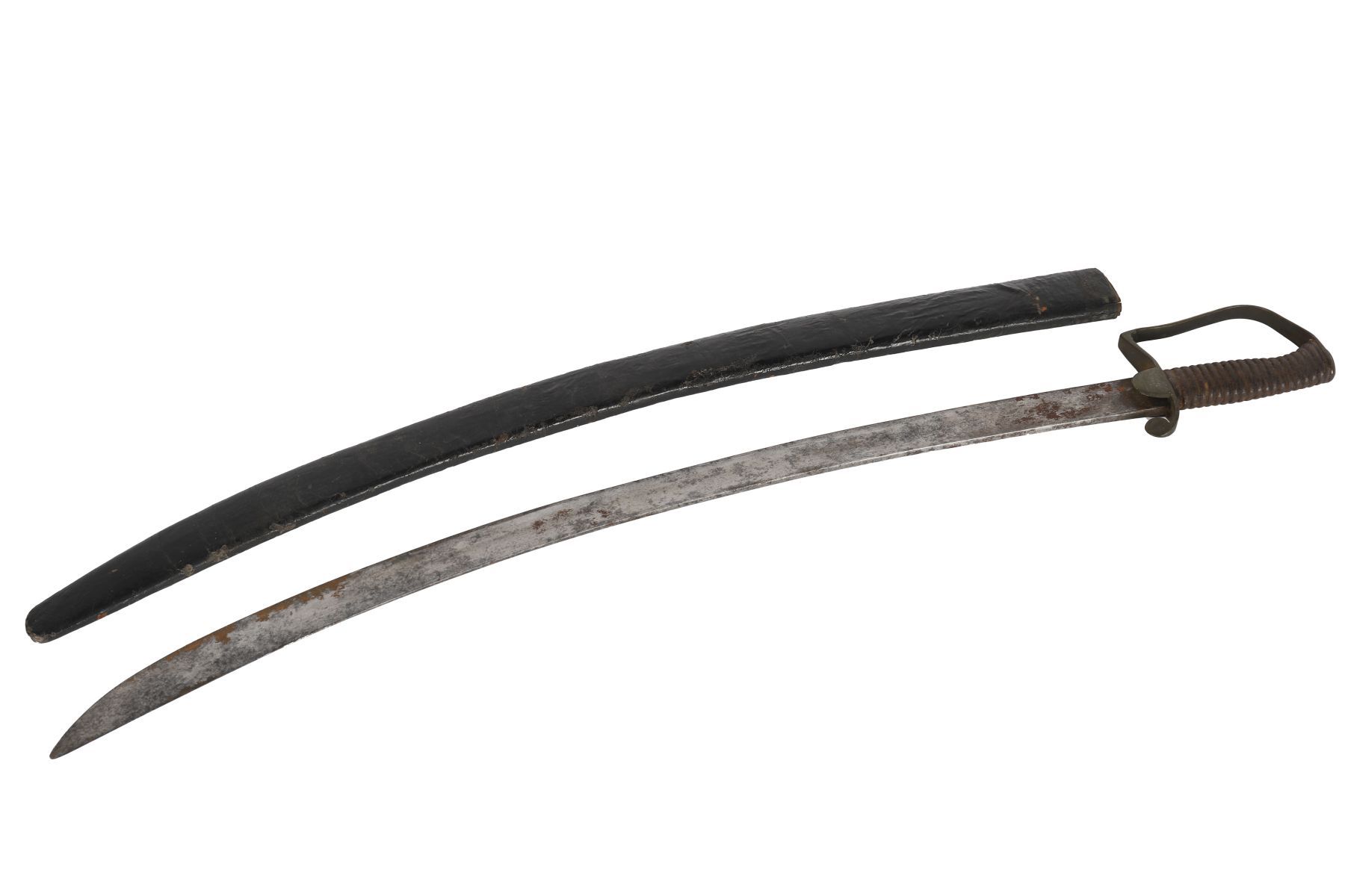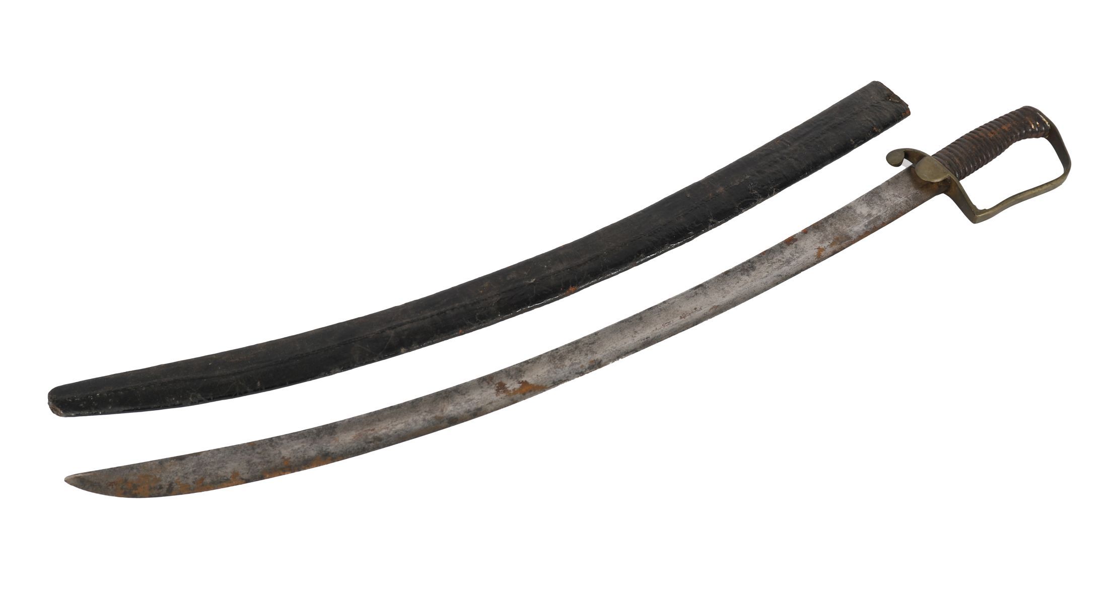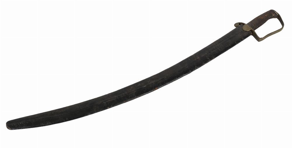 The single-edged curved blade measuring approximately 75 cm., fitted with ribbed grip, D-shaped knuckle guard, and plain hilt furniture, contained within a leather scabbard. Showing surface wear and oxidation consistent with age and service use.