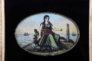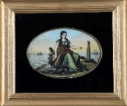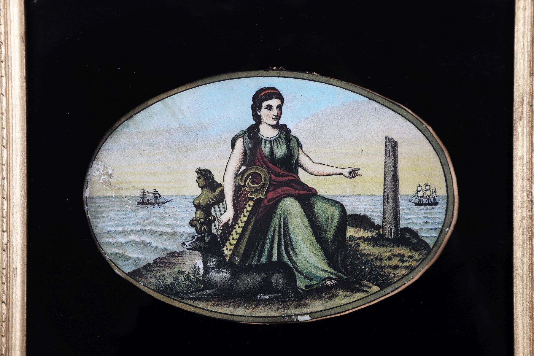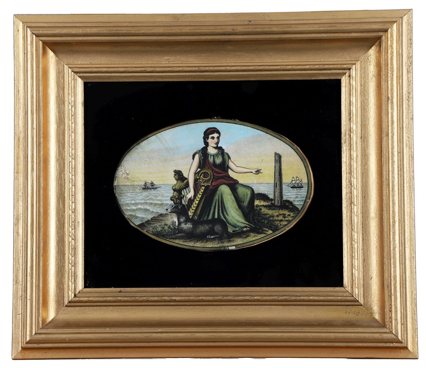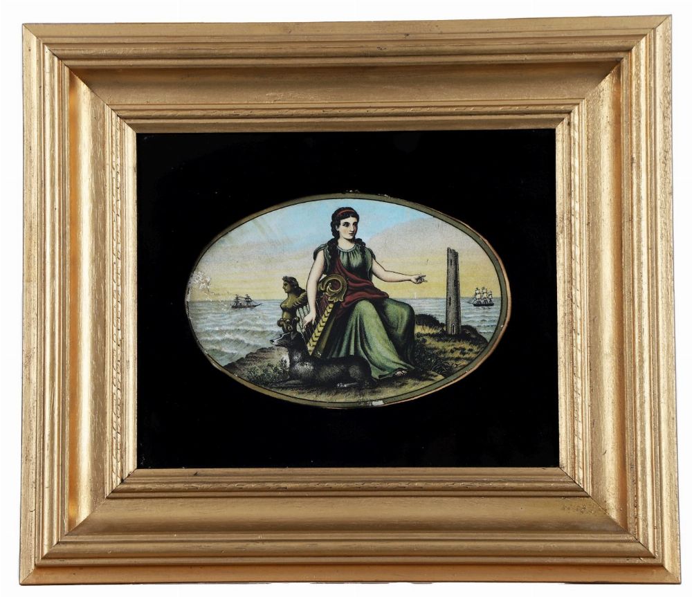 An oval engraving enclosed in a verre églomisé border and gilt frame.