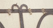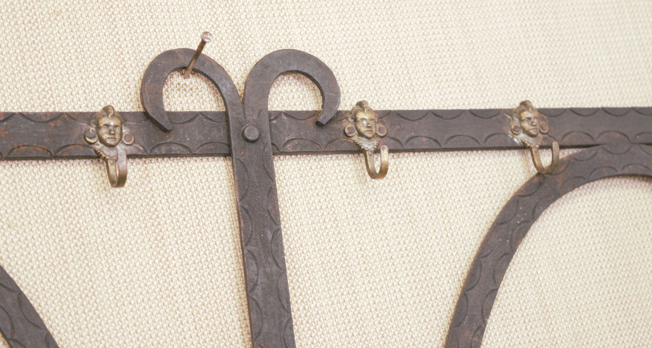 19th-century hand-forged iron wall panel fitted with brass hooks.