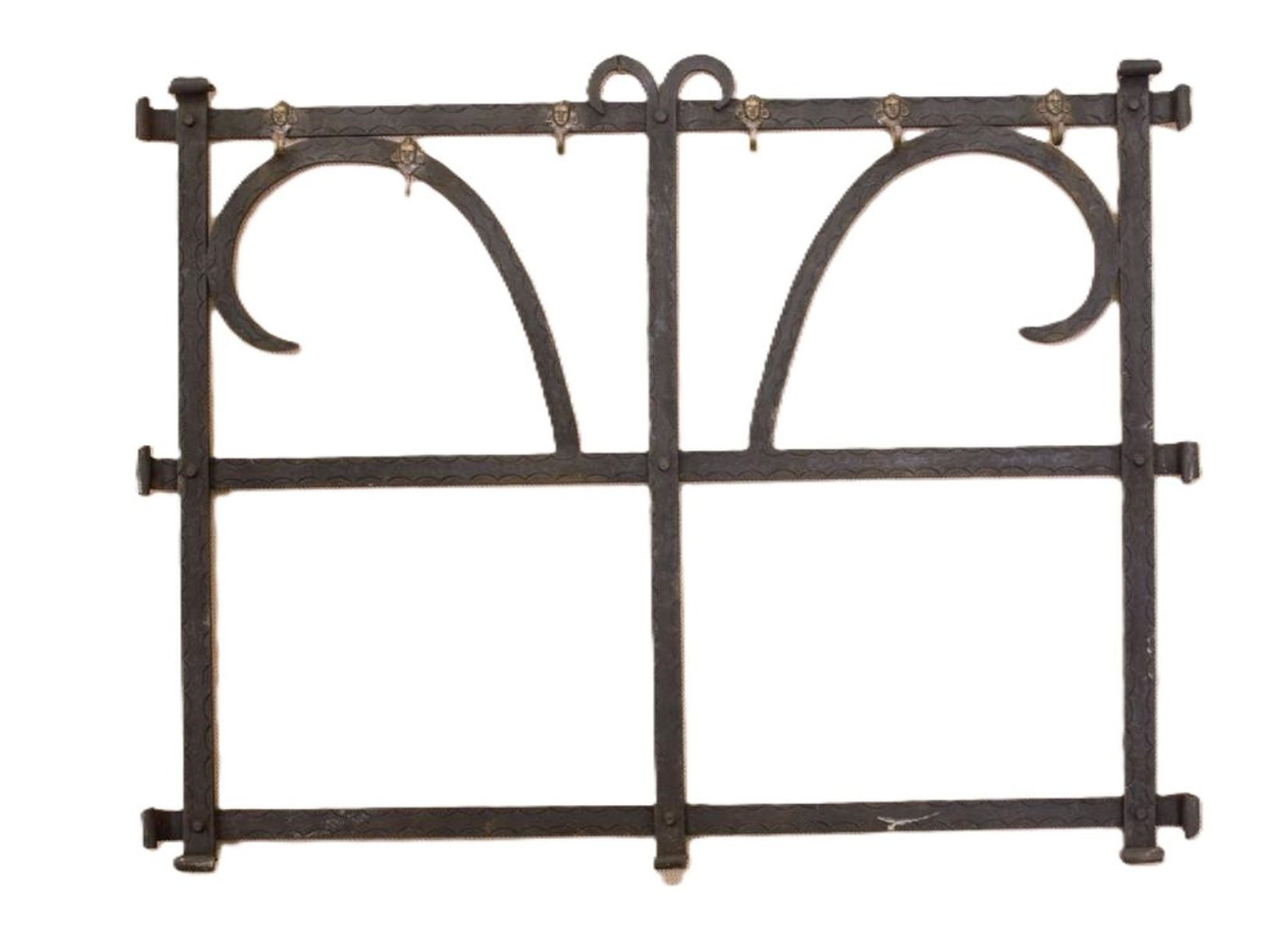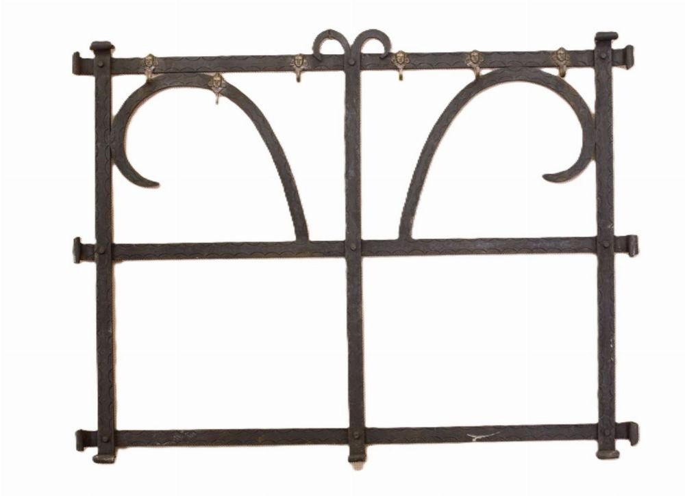 Lot 1728 19TH-CENTURY FORGED IRON WALL PANEL WITH BRASS HOOKS