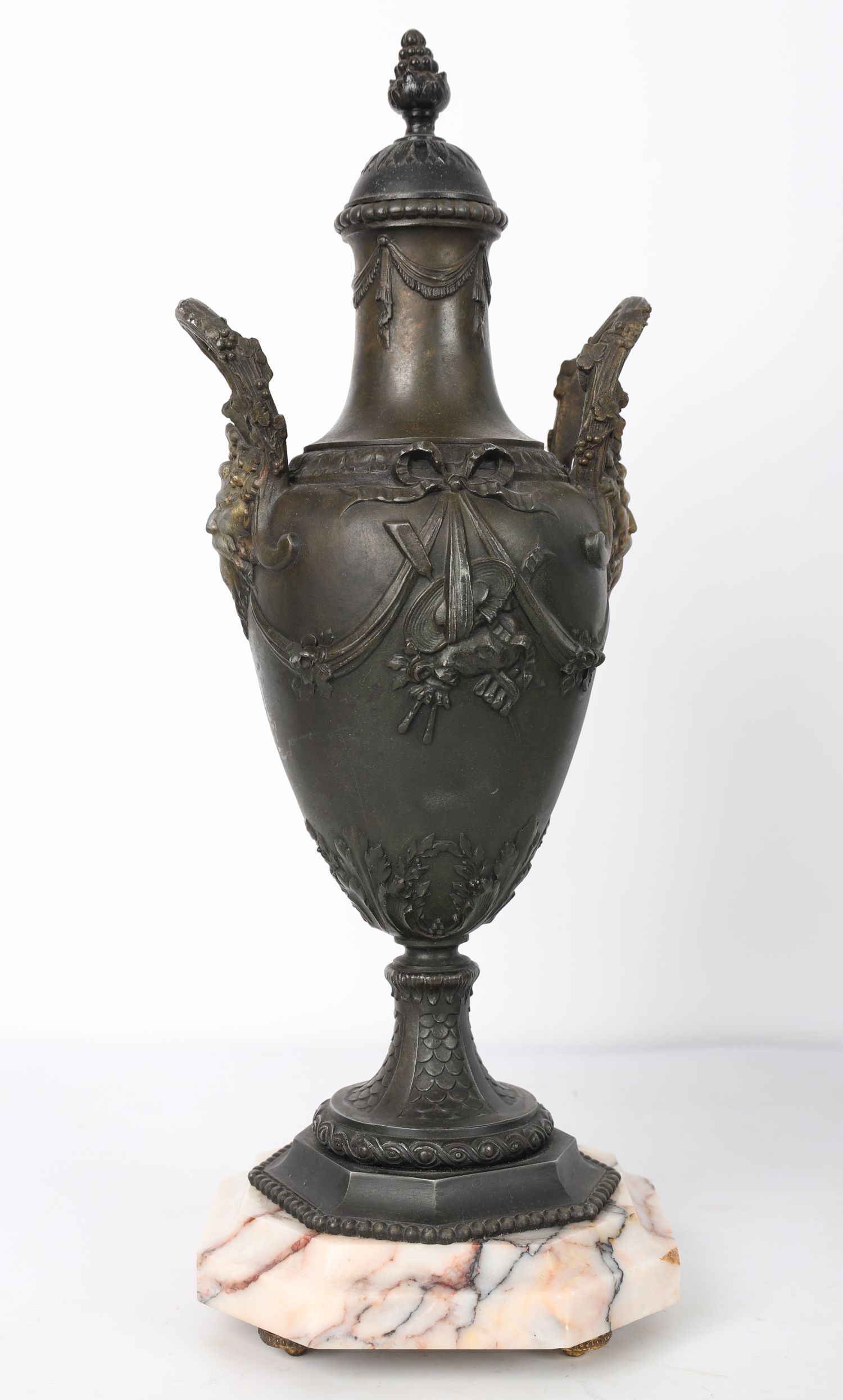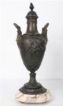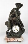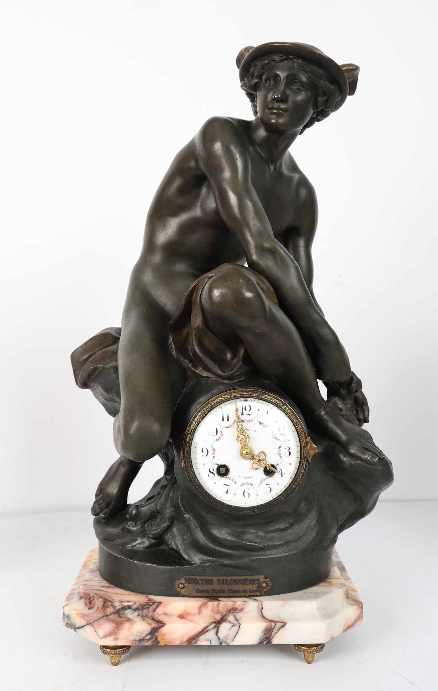 Featuring the classical god Hermes seated atop a finely cast base, flanked by a pair of matching urns with ornate foliate designs. The white enamel dial is inset into the base and bears Roman numerals. Resting on a veined marble plinth.