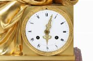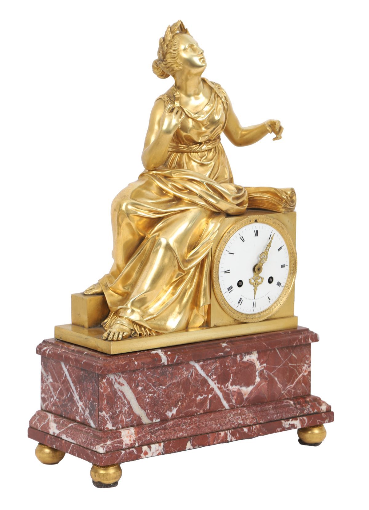 A French mantel clock surmounted by a seated classical female figure in gilt bronze, the drum-form dial set within a rectangular plinth, raised on a veined rouge marble base with gilt feet. 19th century.