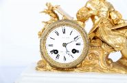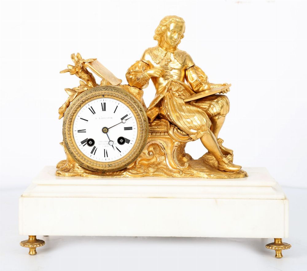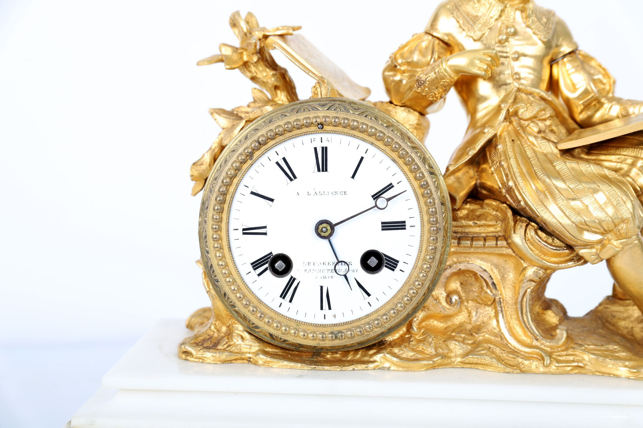 Depicting a noble youth attentively writing, this elegant timepiece is mounted on a polished white marble plinth. Roman numerals mark the white enamel dial, signed A. L'alliance Le Forestier Paris