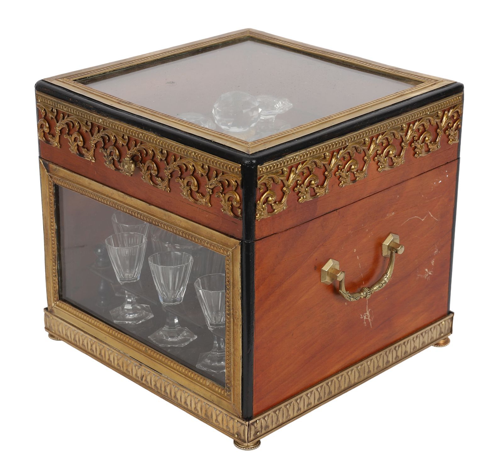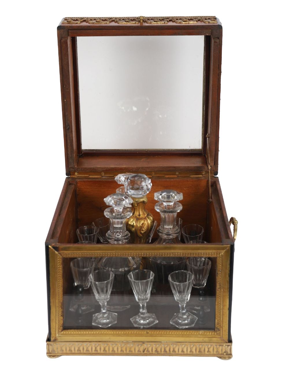 A fine 19th-century French cave à liqueur, the rectangular mahogany case with bevelled glass panels to all sides and gilt-bronze mounts, the hinged lid opening to a mirrored interior fitted with a removable gilt-bronze caddy holding four cut crystal decanters with faceted stoppers and twelve matching liqueur glasses. The crystal is finely cut, with matching faceted decoration to the decanters and glasses.