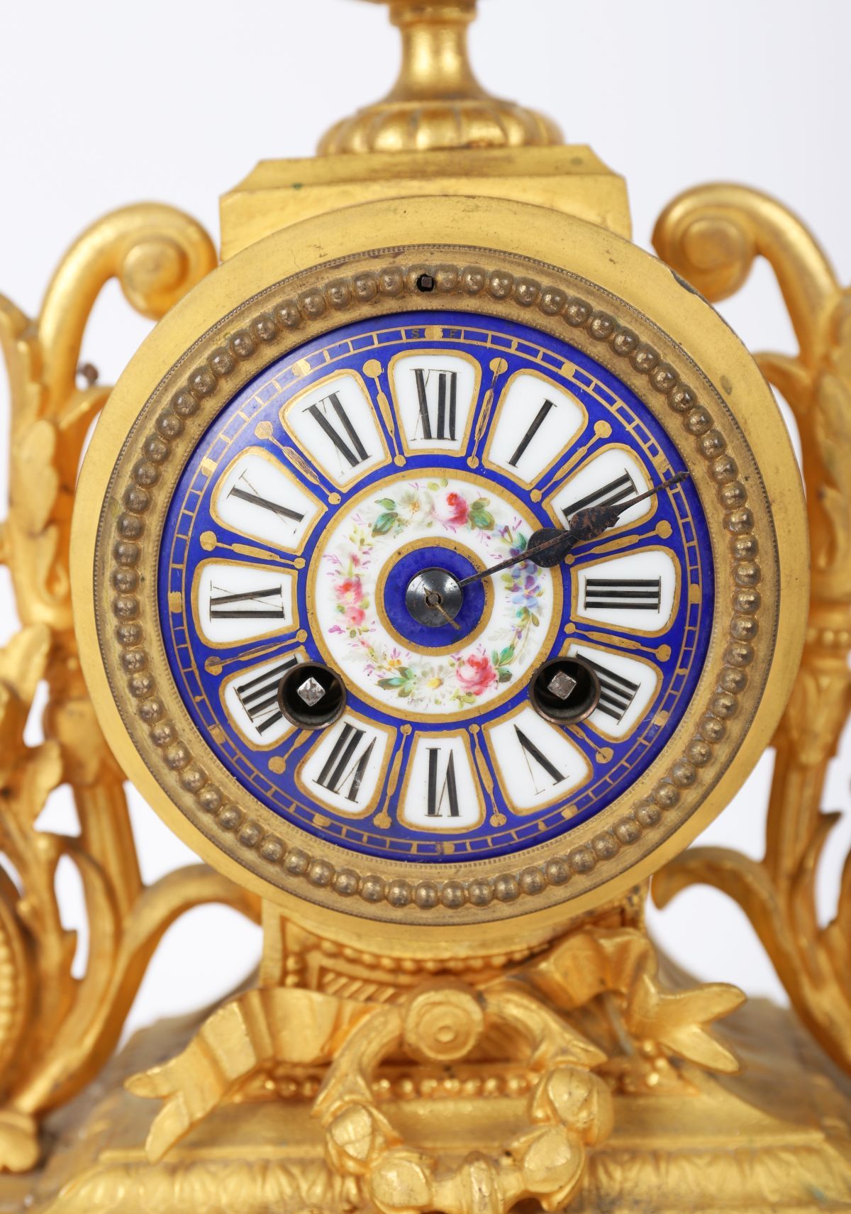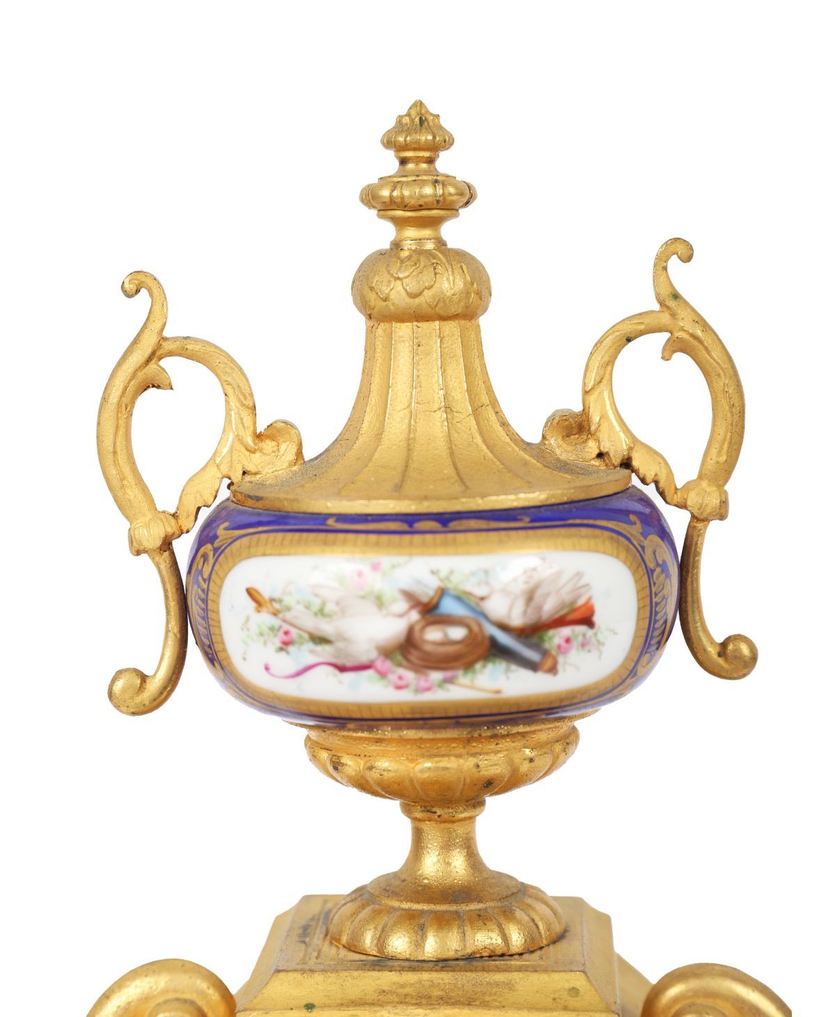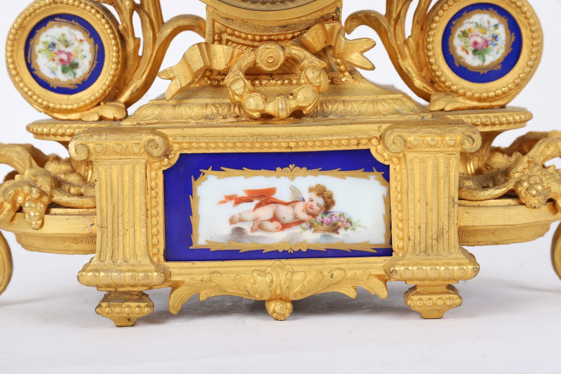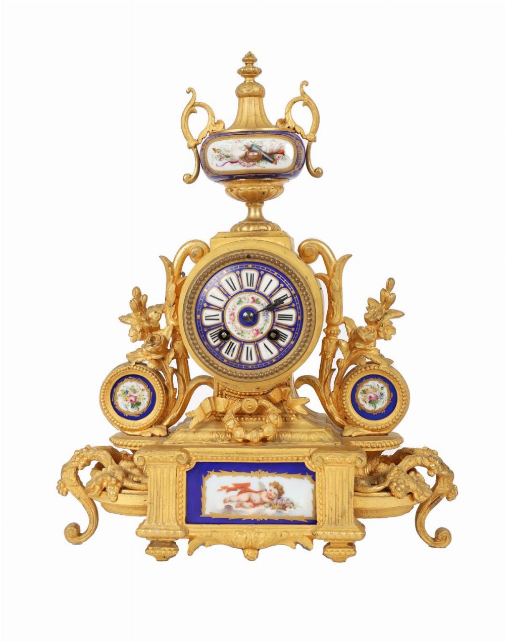 A fine gilt metal and porcelain-mounted mantel clock, richly decorated with hand-painted Sèvres-style panels of cherubs and floral garlands, enamel dial with Roman numerals. French, 19th century.