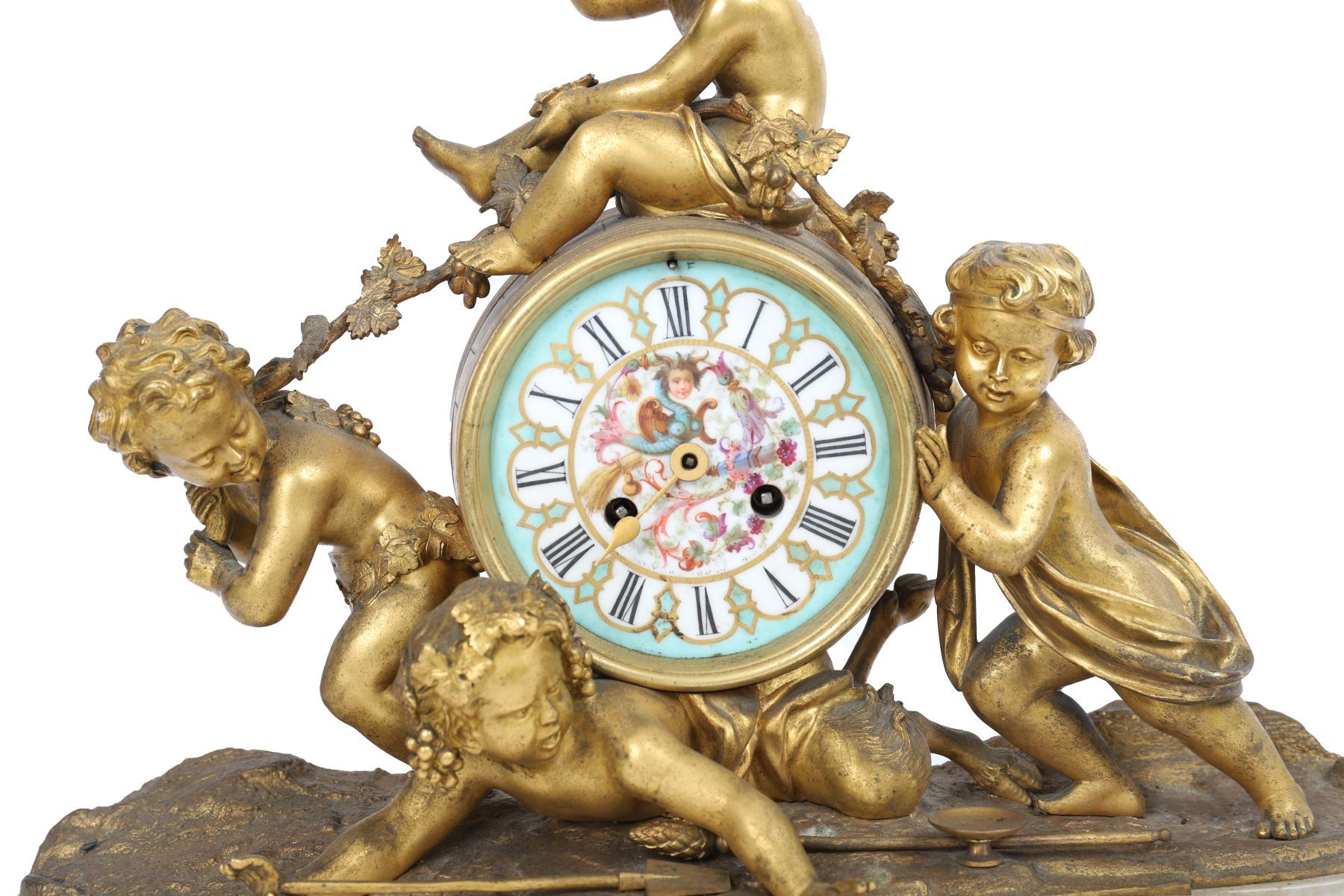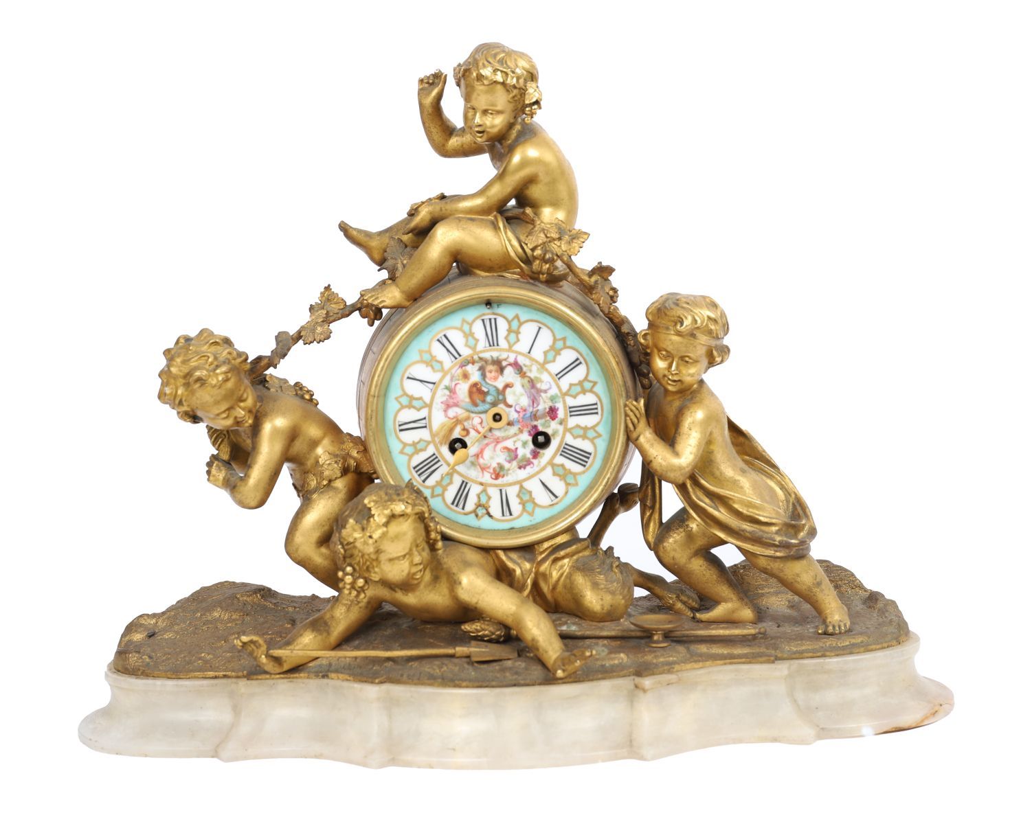 A 19th-century French ormolu figural mantel clock, the circular enamel dial decorated with painted cherubs and Roman numerals, enclosed within a case surrounded by four playful putti on a naturalistic base. Raised on a shaped alabaster plinth.