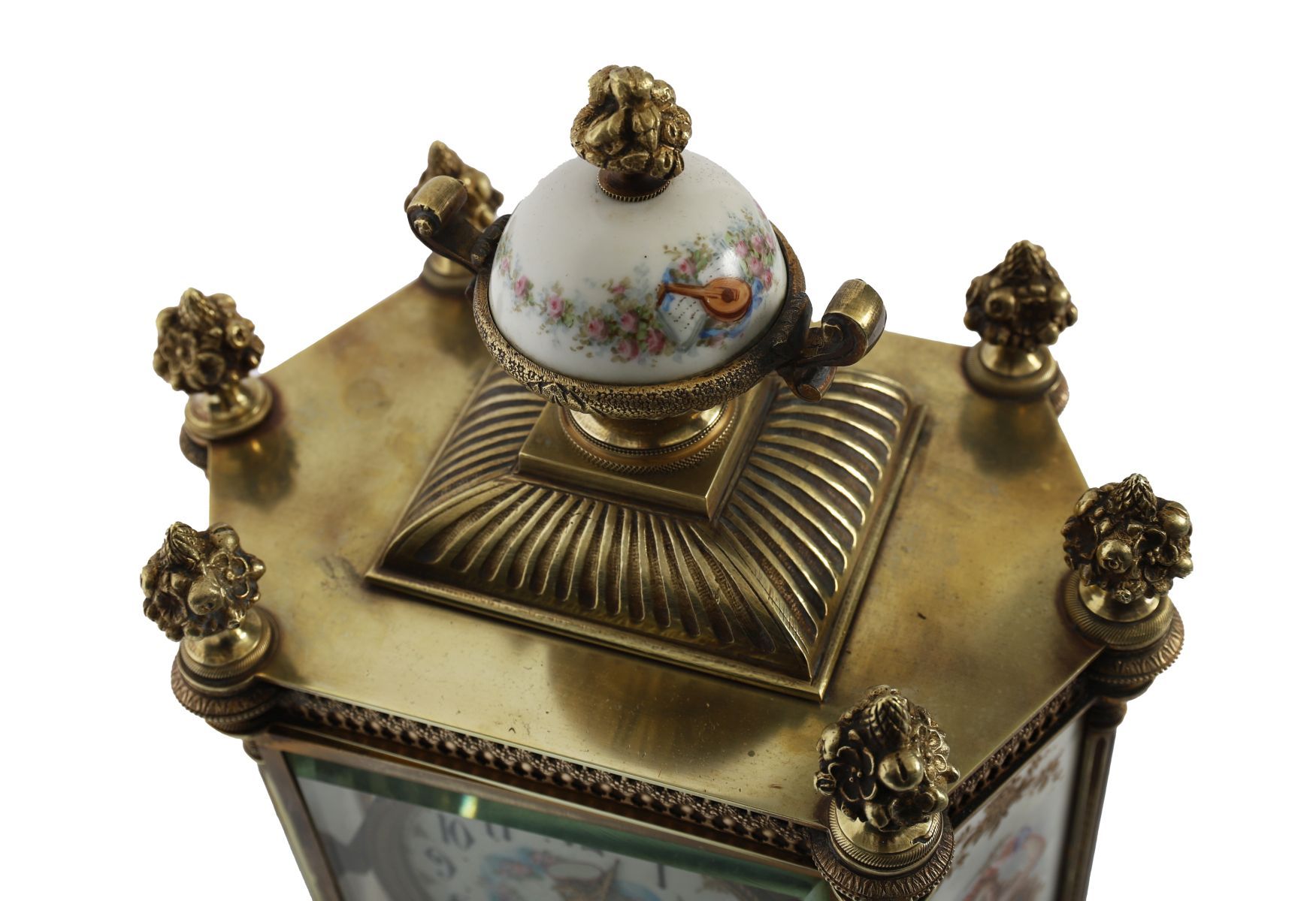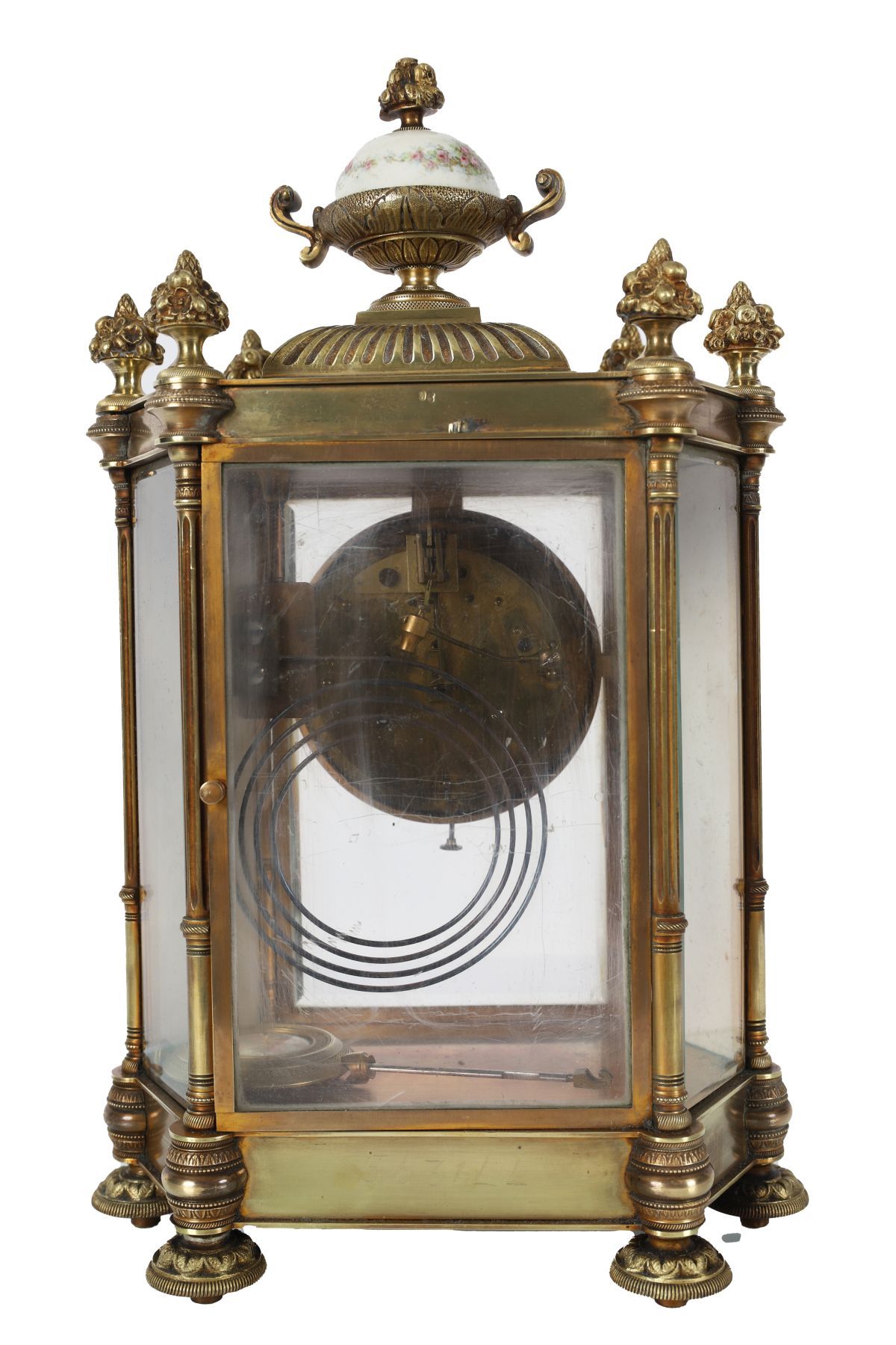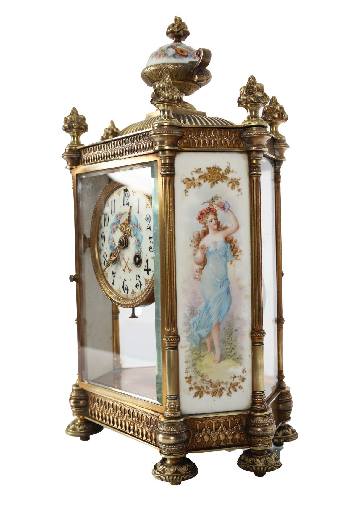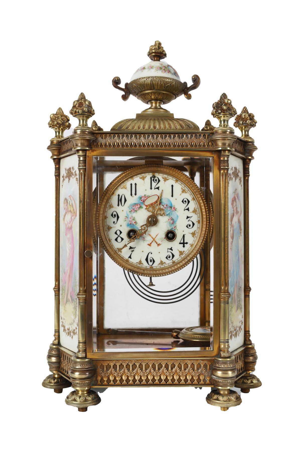 A fine 19th-century French ormolu and Sèvres-style mantel clock, the glazed four-panel case with porcelain side plaques finely painted with classical figures, the dial with floral garlands and Arabic numerals. Surmounted by an urn finial and raised on turned feet with pierced ormolu apron.