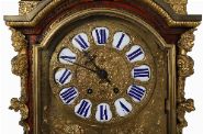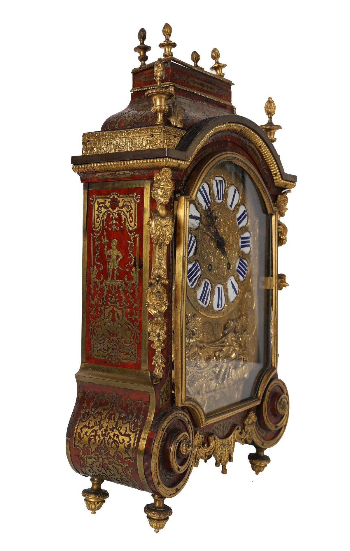 Louis XV-style boulle marquetry clock with tortoiseshell and brass inlay, ormolu mounts and a finely engraved dial with enamel Roman numerals.