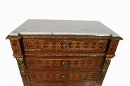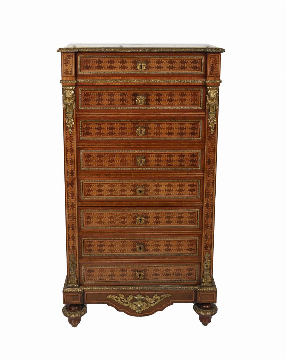 A French Louis XVI style parquetry secrétaire à abattant, the marble top above a fall-front writing surface enclosing fitted drawers and pigeonholes, over long drawers, with ormolu mounts and geometric marquetry decoration.