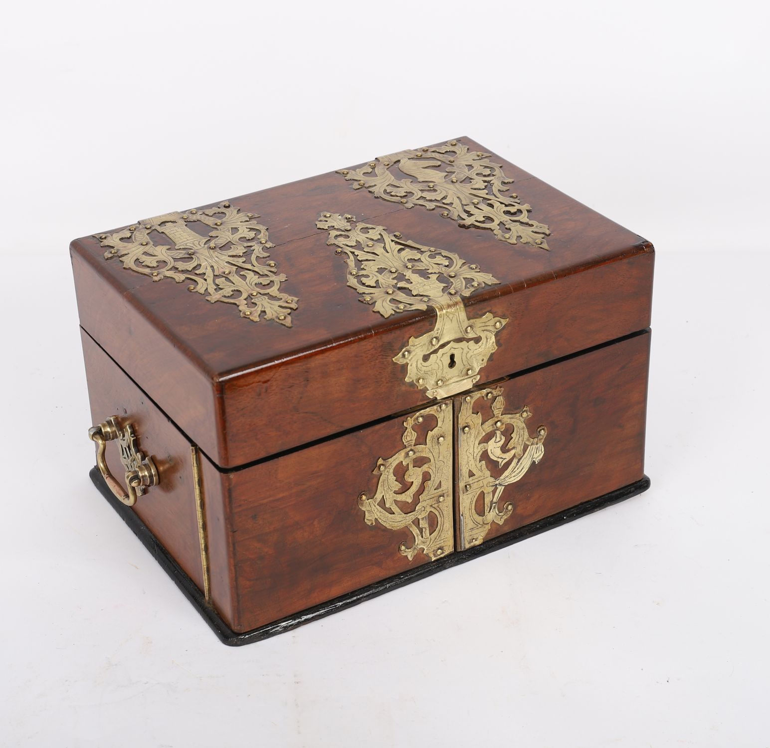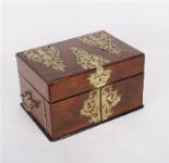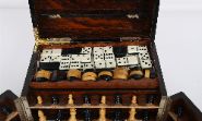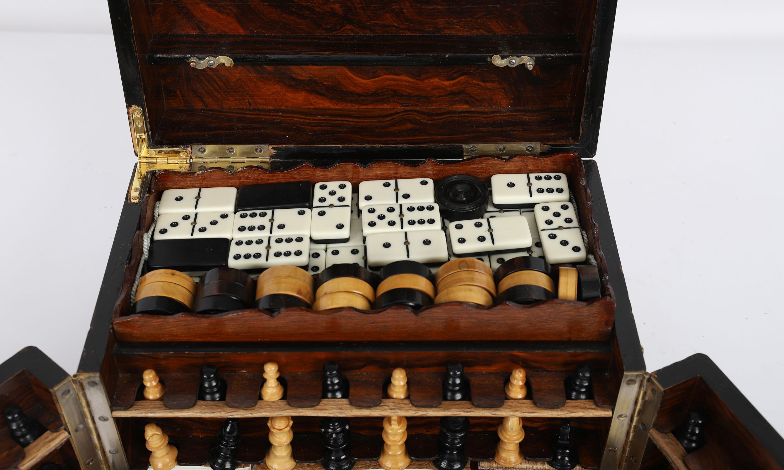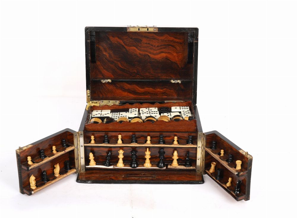 A mahogany-cased 19th century games compendium with brass mounts, opening to reveal multiple compartments housing a variety of games including chess, draughts, dominoes and counters.