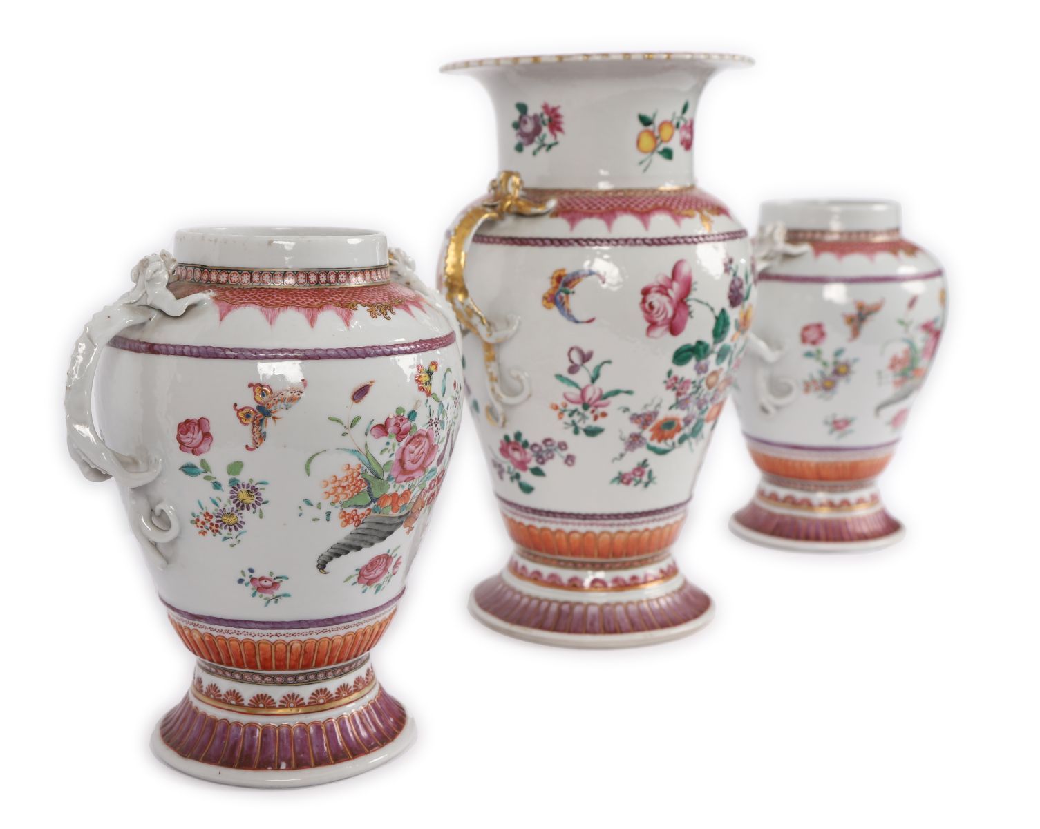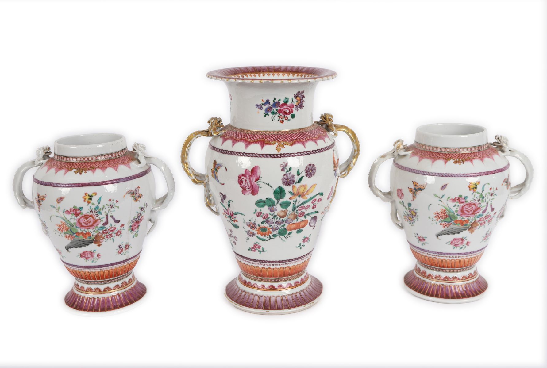 with large central vase furnished with dragon scroll handles flanked on either side by an ovoid shaped vase each raised on a circular foot.