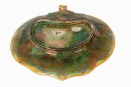 Decorative majolica dish modelled as overlapping vine leaves and blossom, with branch handle, glazed in vibrant greens, blues and browns. Attributed to George Jones, English, 19th century.