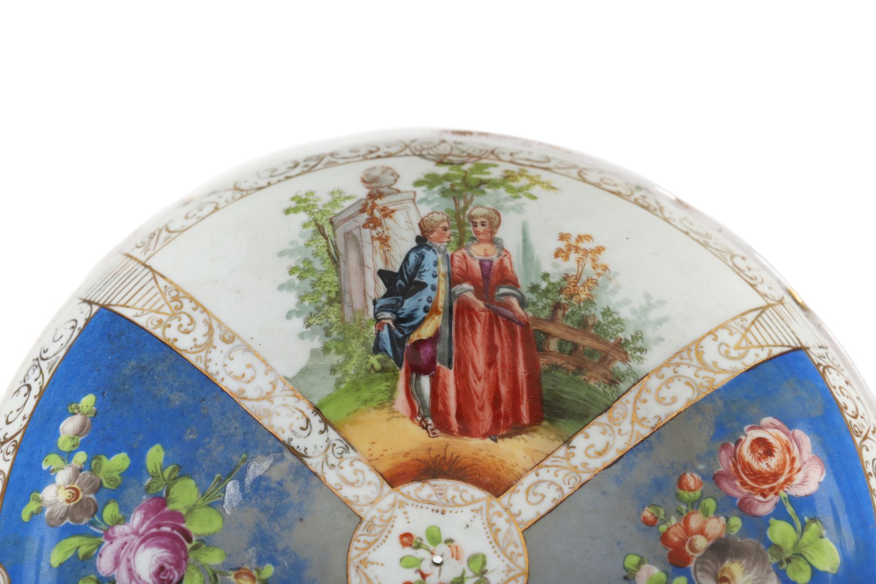with alternating floral and figure painted panels.