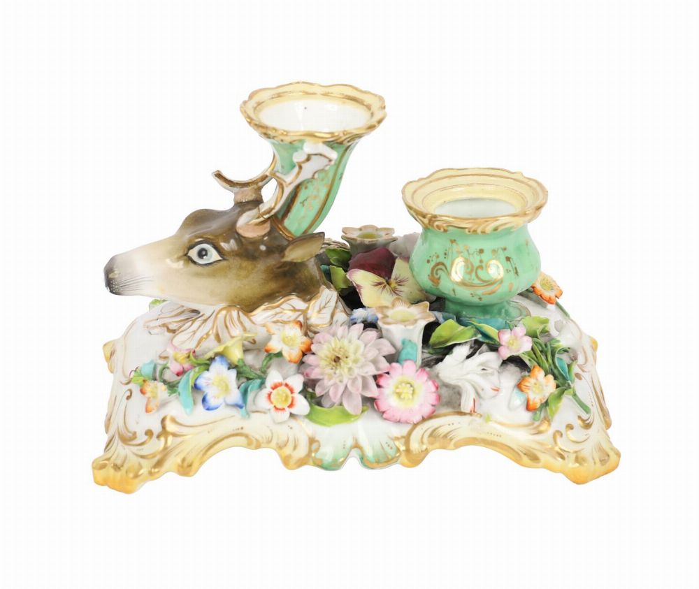 Decorative porcelain ink stand modelled with floral encrusted base and deer motif.