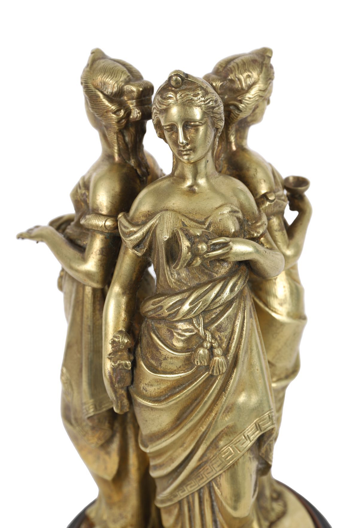 A 19th-century gilt-bronze figural group modelled as The Three Graces, depicted as three classical female figures standing back-to-back around a central support, each draped in flowing classical garments and posed with gently extended arms. The group raised on a circular gilt base and mounted on a stepped ebonised plinth. The composition reflects the neoclassical revival taste of the period, inspired by Greco-Roman allegorical sculpture symbolising beauty, charm, and harmony.
