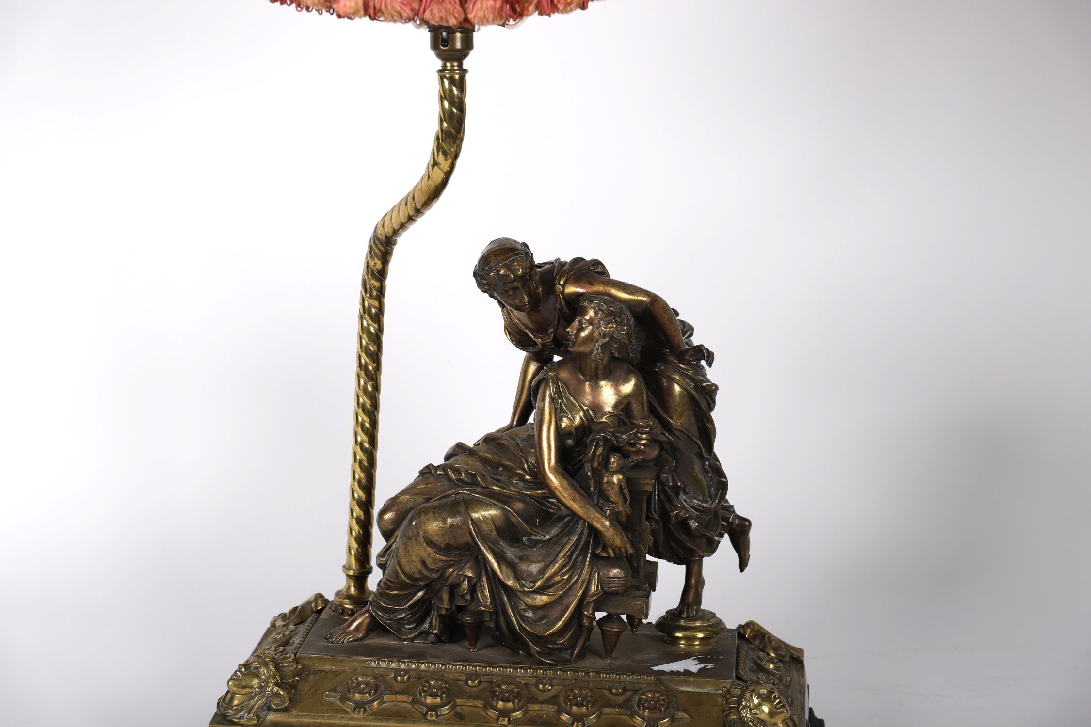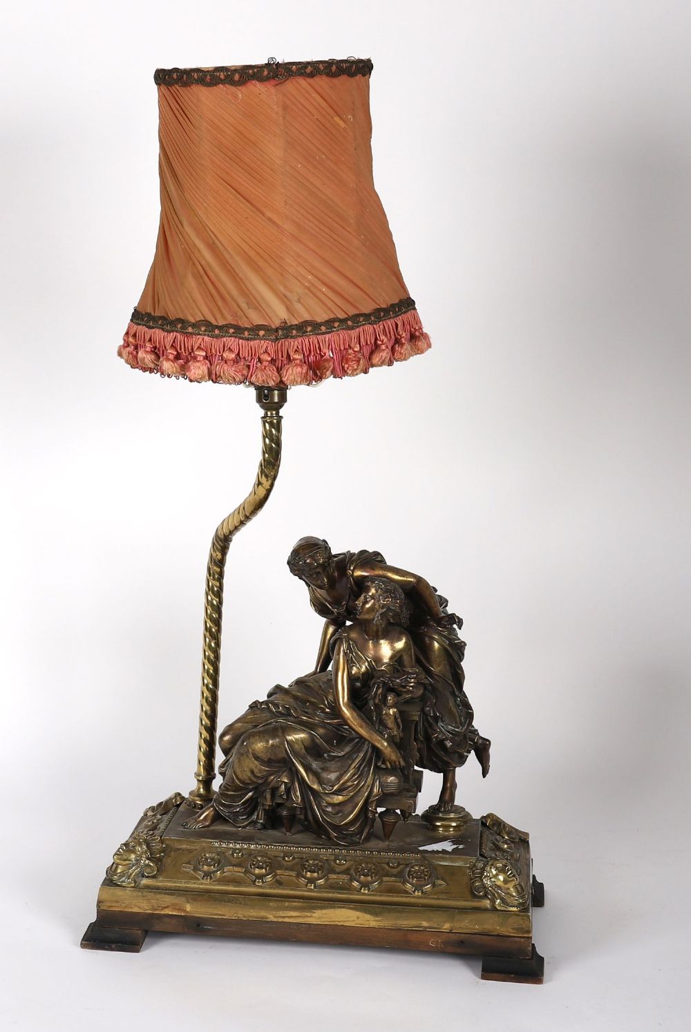 A finely cast 19th-century gilt bronze figural lamp, depicting a romantic scene with two classical ladies: one reclining on a chaise longue and discreetly sheltering a young boy or putto beneath her drapery, while the other leans in to converse. The figures are rendered in high relief with expressive gestures and flowing drapery. Set on a richly decorated rectangular gilt bronze base with floral garland frieze and anthemion corners, raised on ebonised bracket feet. Fitted with a rope-twist standard and a later fringed fabric shade.
