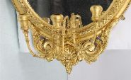 An ornate 19th-century oval gilt framed mirror, surmounted by a scroll and foliate crest, and fitted with twin gilt candle branches of scrolling acanthus design. Beaded and ribbon-twist frame.