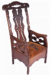 the tall railed and pierced rose carved back, above a leather upholstered seat, between wooded arms, raised on turned legs to the fore, joined by a panelled apron