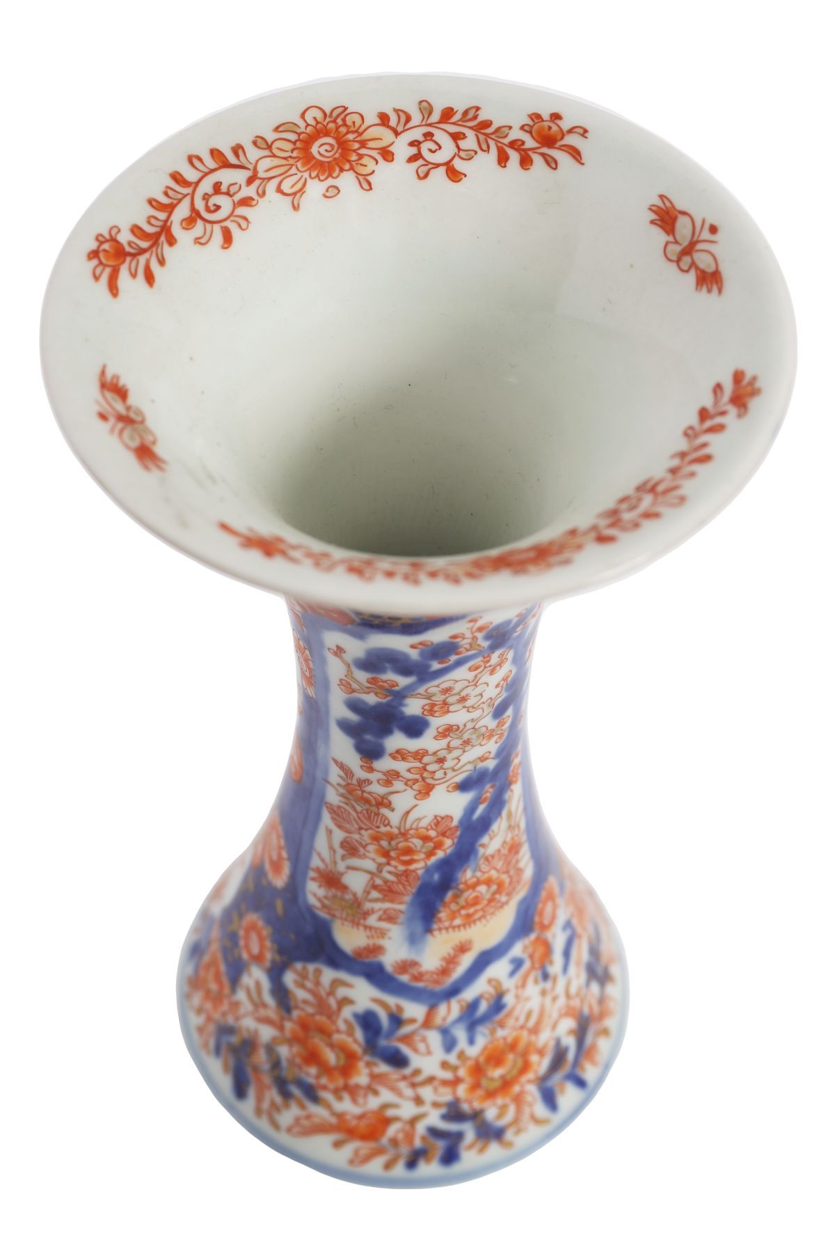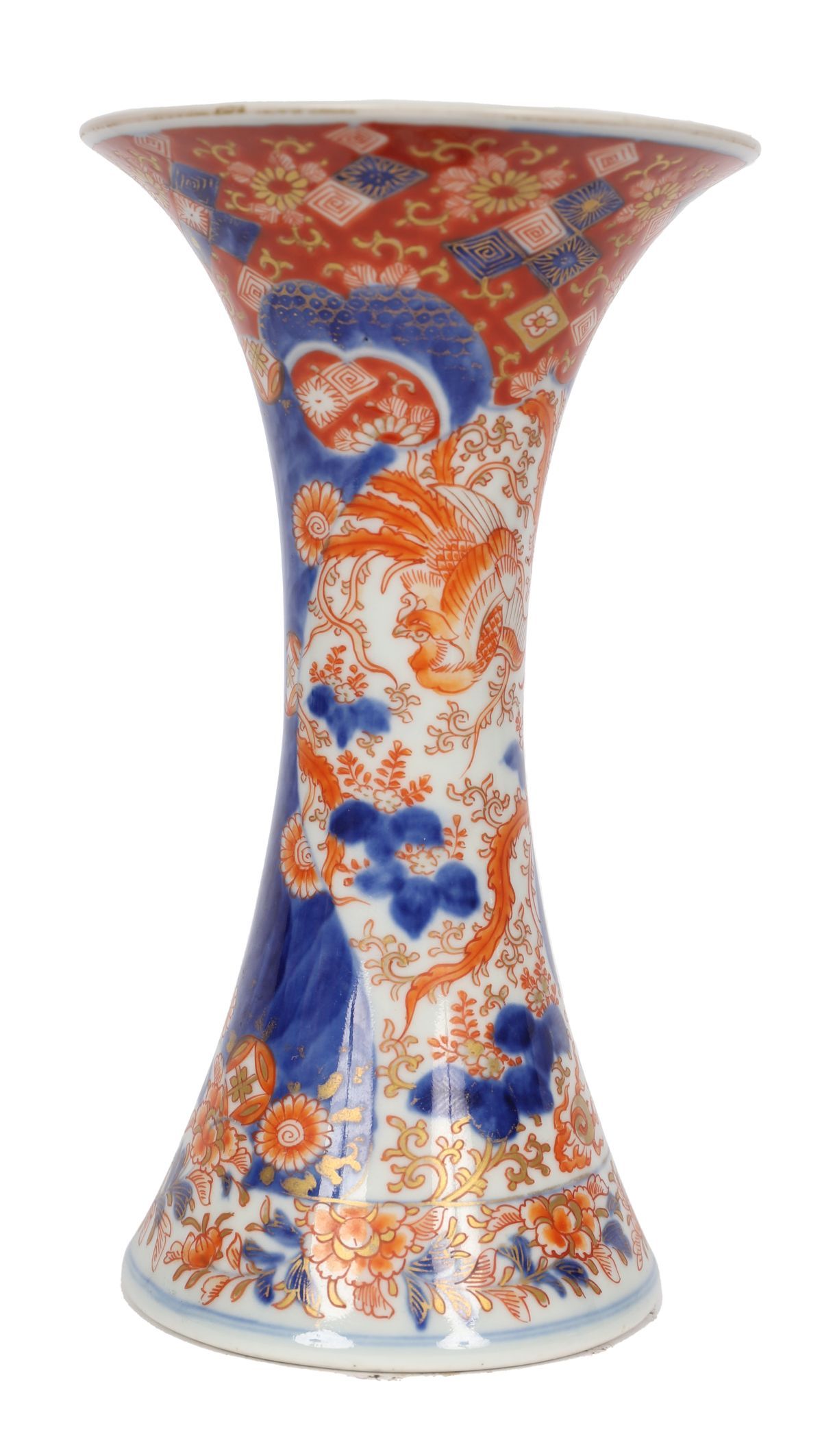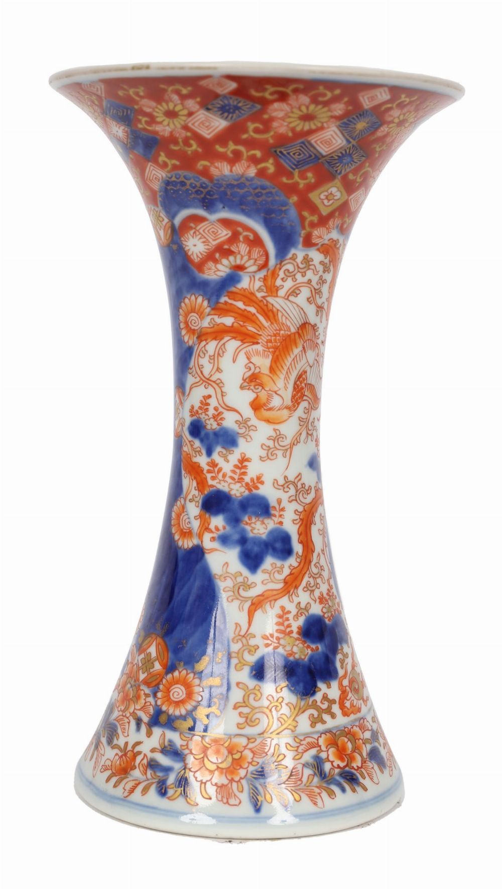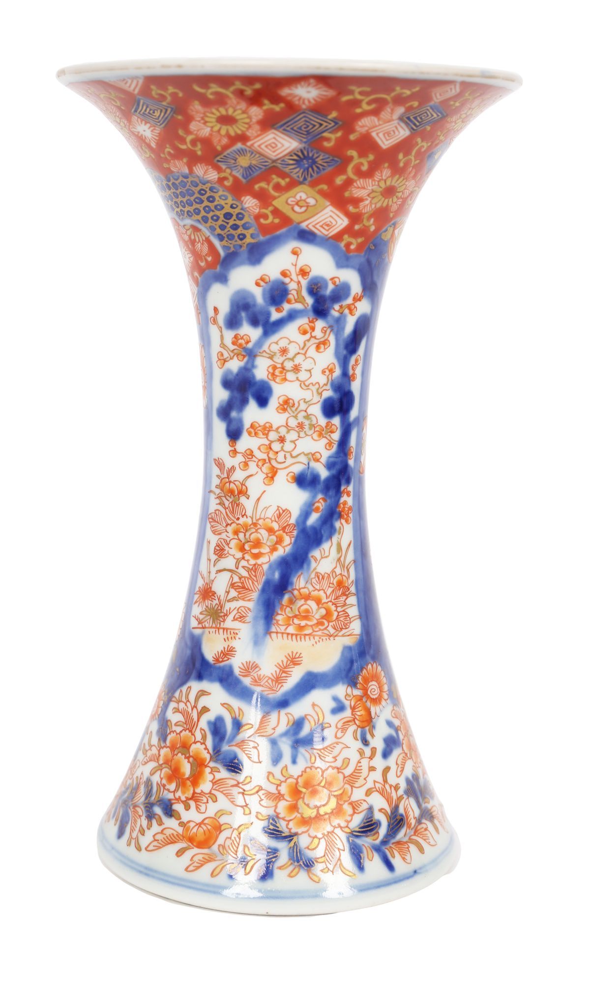 19th-century Imari polychrome porcelain vase of waisted trumpet form, richly decorated in Imari palette with panels of birds, flowering branches and stylised foliage in iron-red, cobalt blue and gilt.