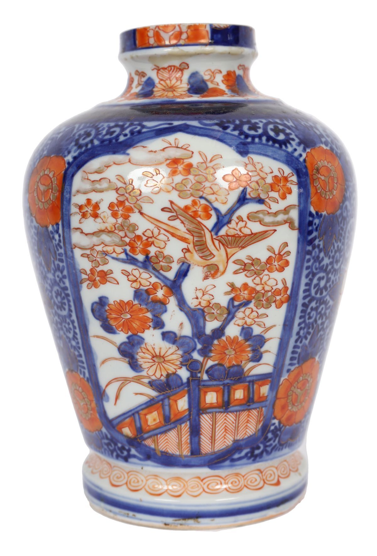 19th-century Imari polychrome porcelain jar of ovoid form with short neck, decorated with a central panel of flowering tree and bird within cobalt borders, reserved against a diaper ground with iron-red roundels.