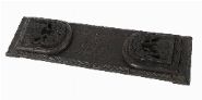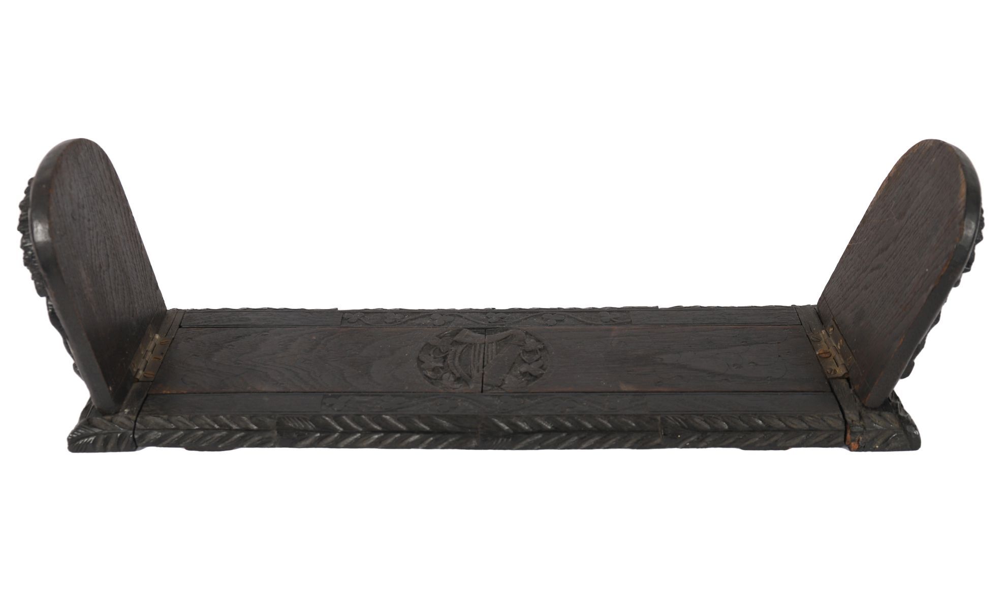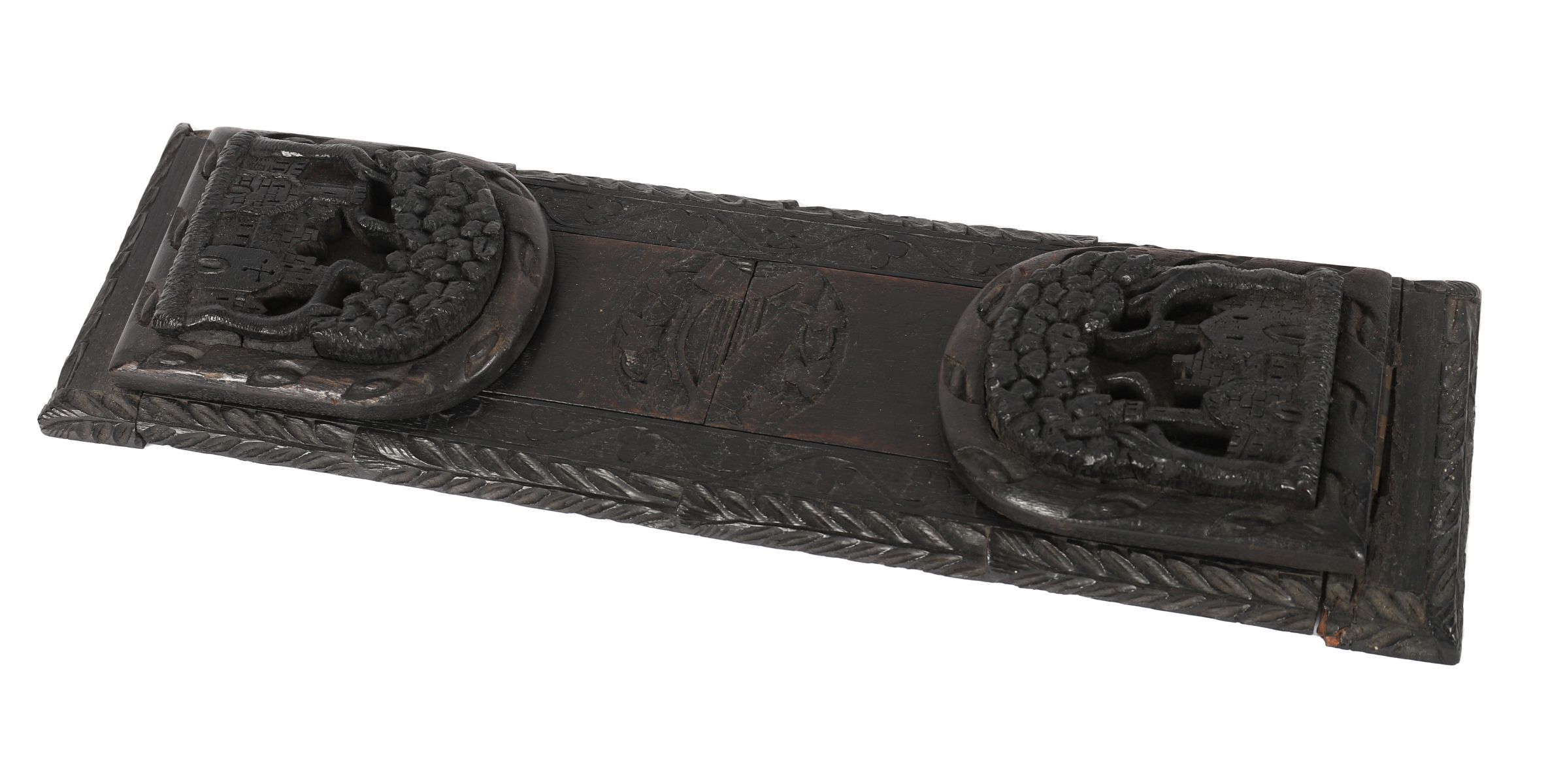 A 19th-century Irish bog oak book slide, carved in relief with Celtic strapwork and shamrock motifs, the central panel carved with a harp within a wreath. Irish, 19th century.