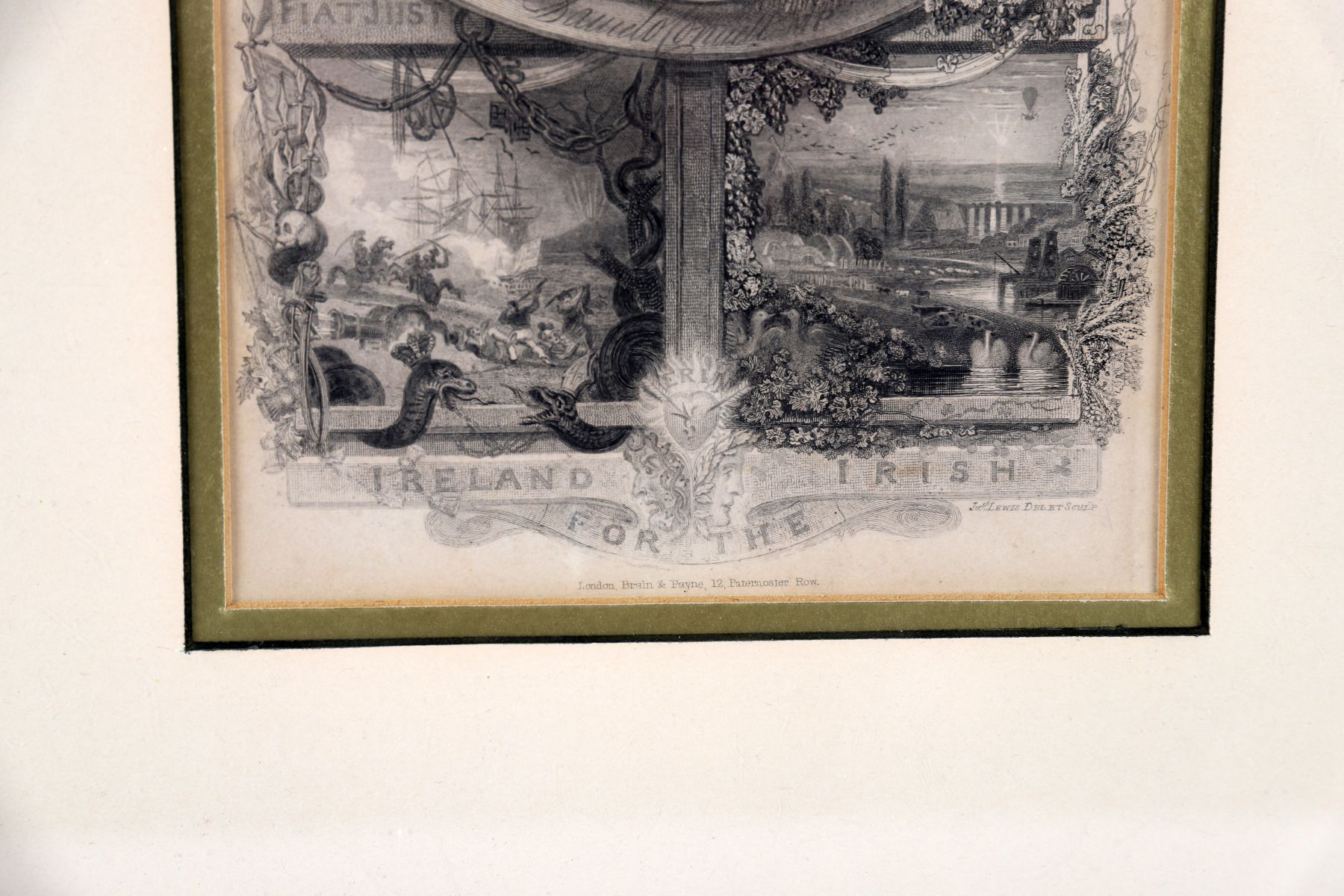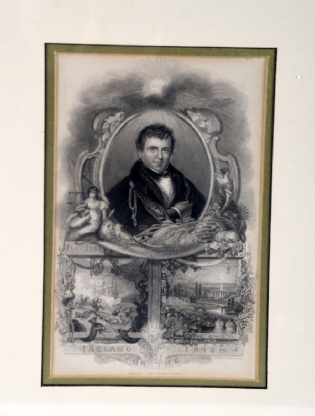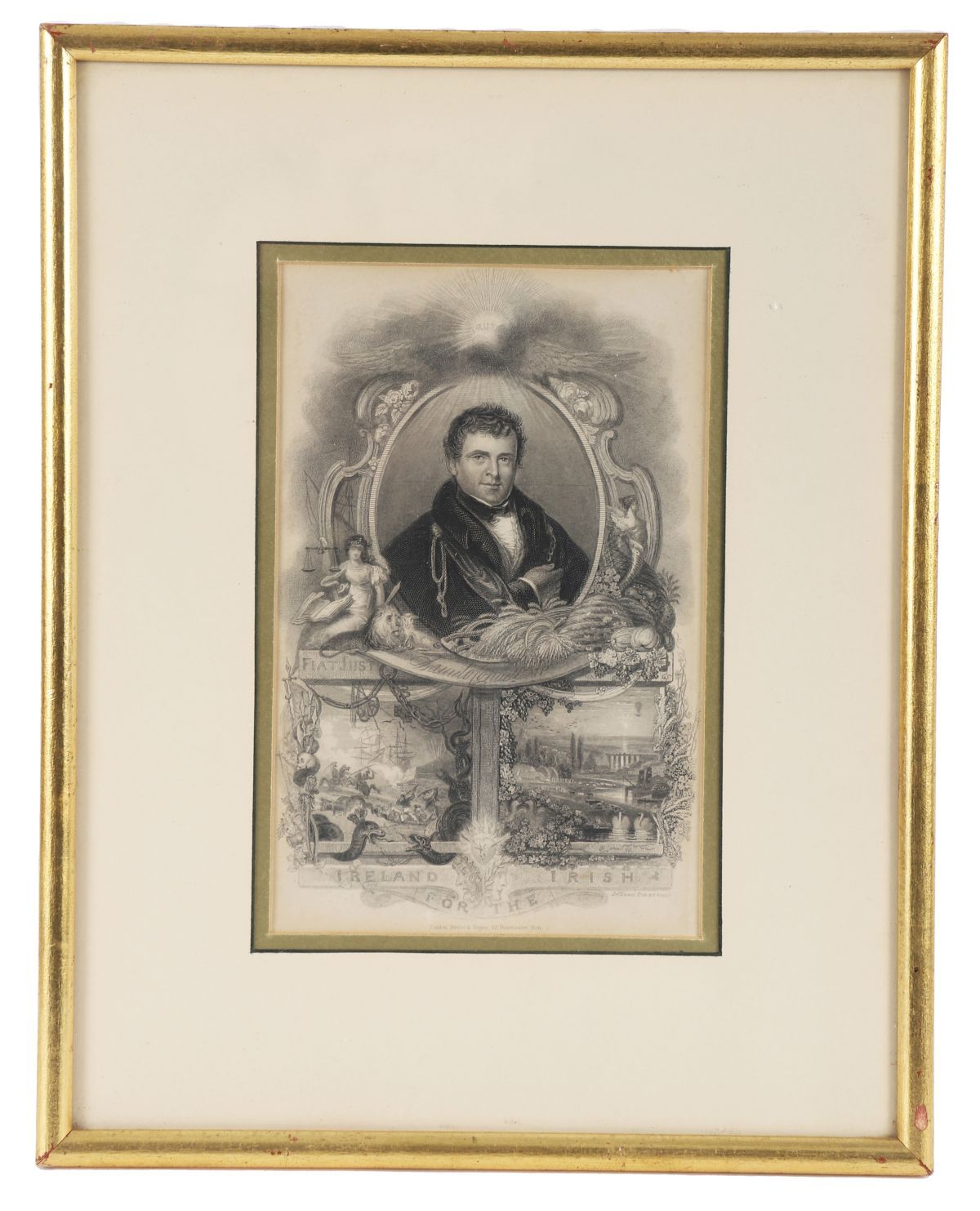 An original engraved portrait of Daniel O’Connell, within an elaborate allegorical surround incorporating Irish emblems and inscriptions, framed and glazed.