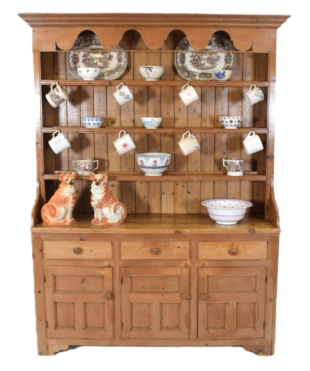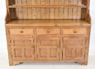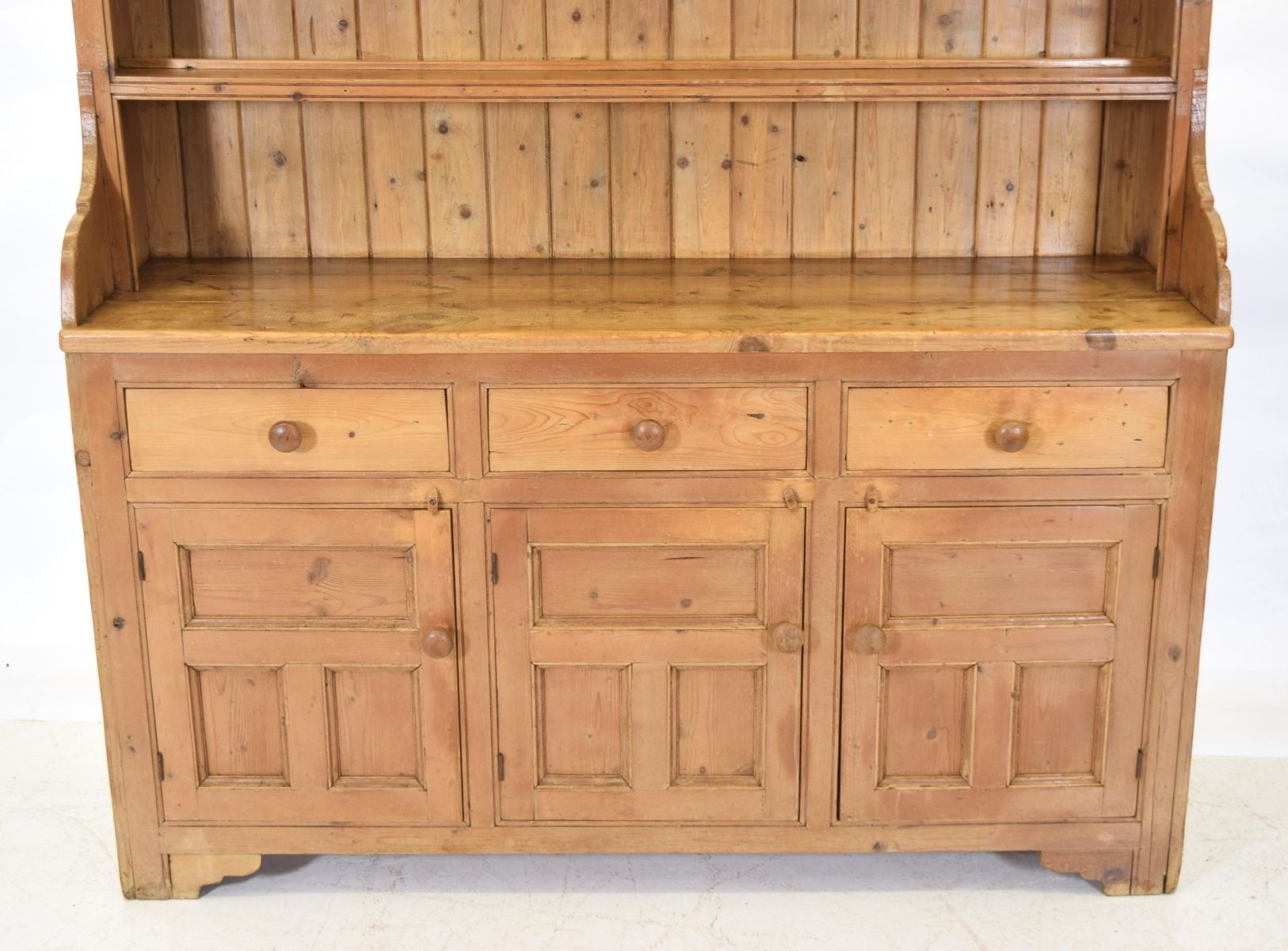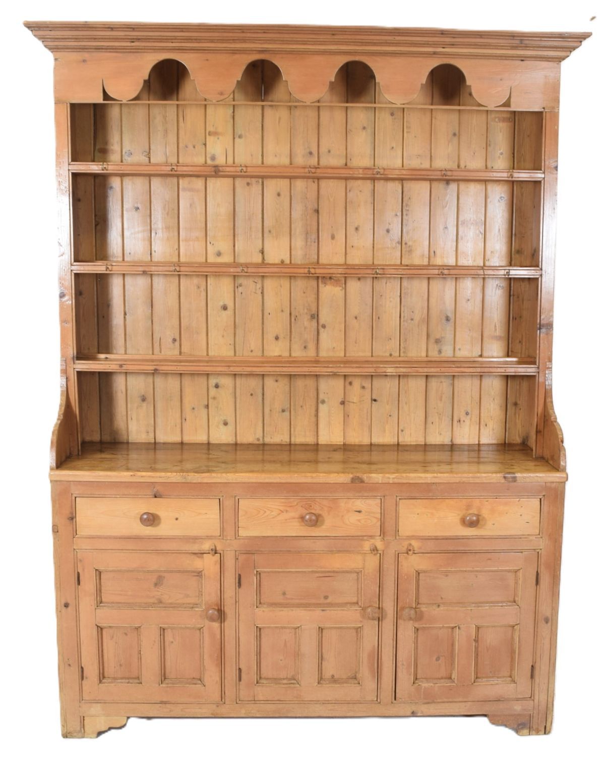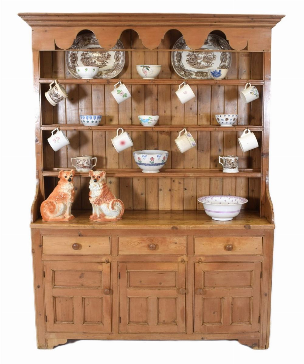 19th-century Irish pine dresser with open shelves and plate rack section, above three drawers, and three doors.