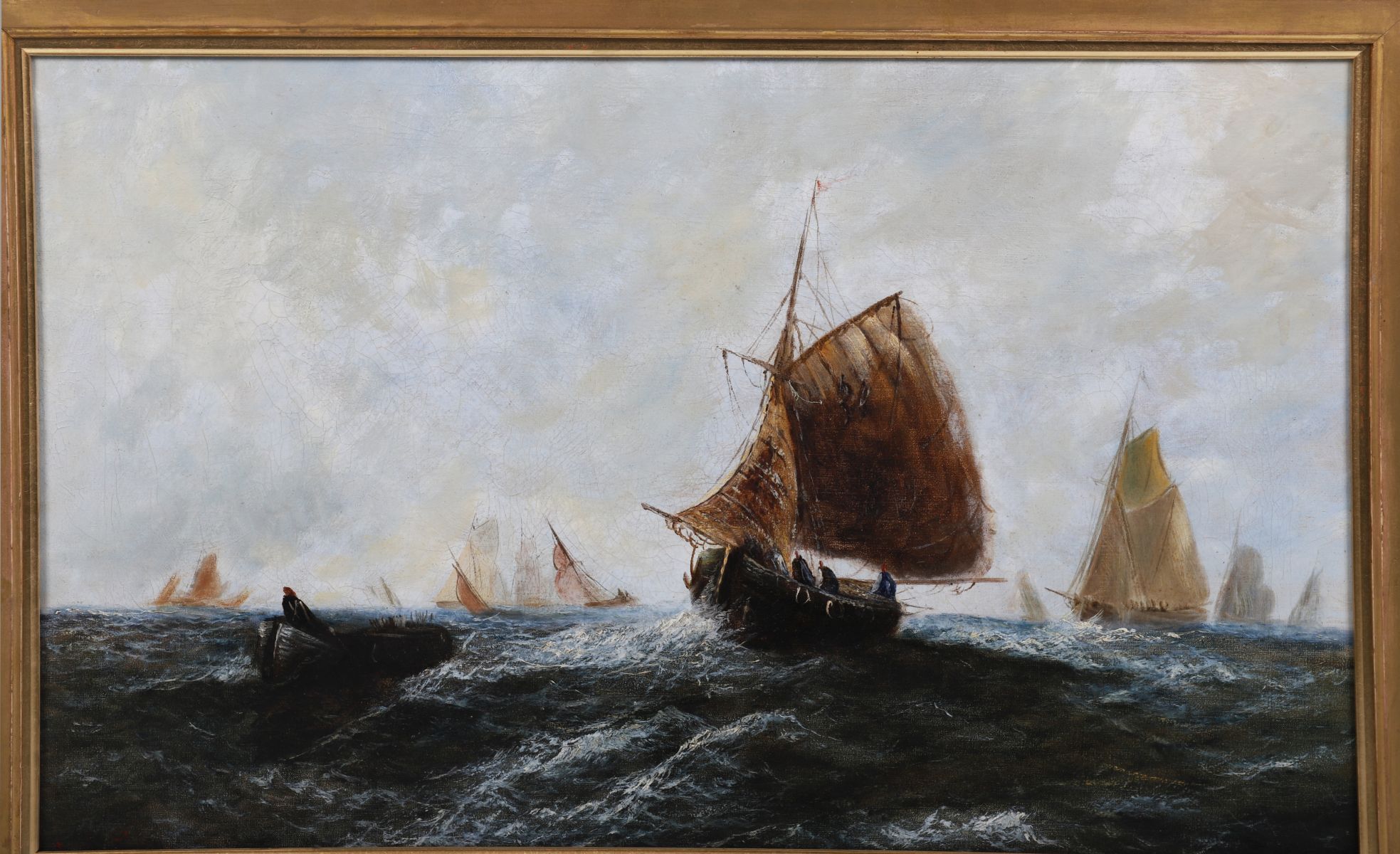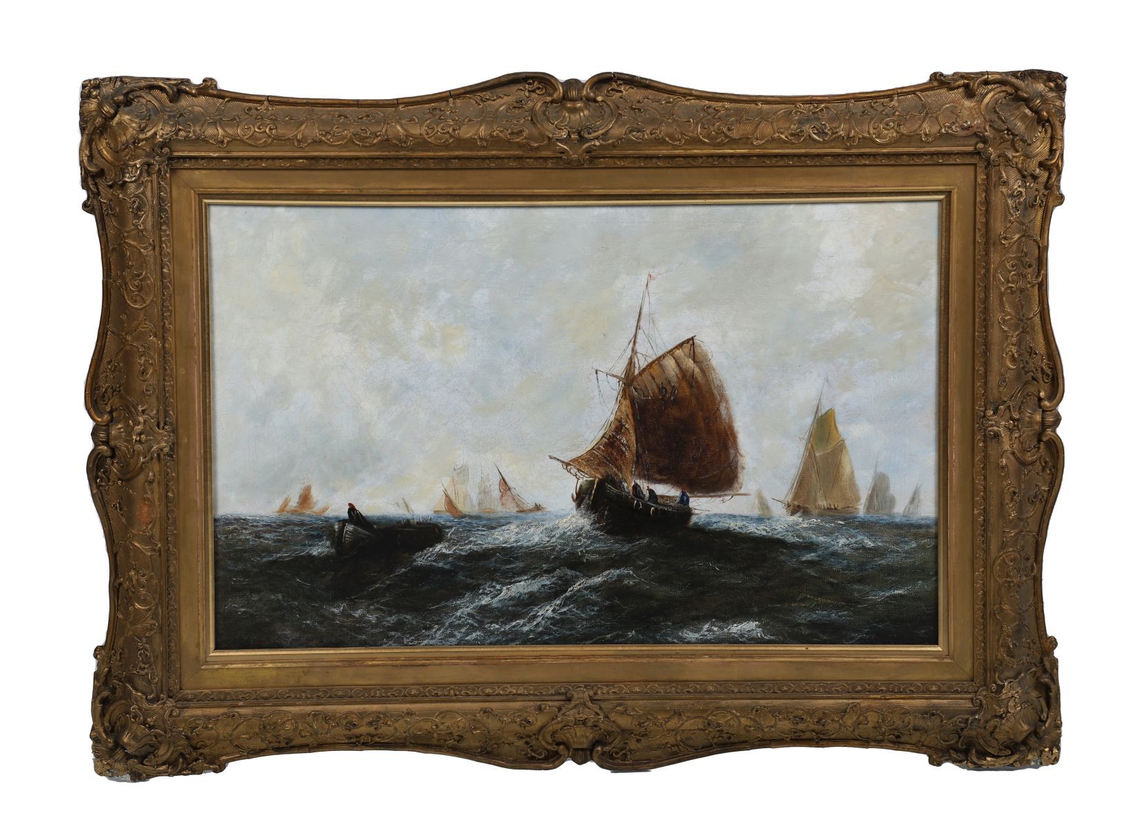 A 19th-century Irish School oil on canvas depicting fishing vessels under sail in choppy seas, figures aboard the foreground boat, and other craft visible in the distance beneath a dynamic sky. Presented in an ornate gilt frame.