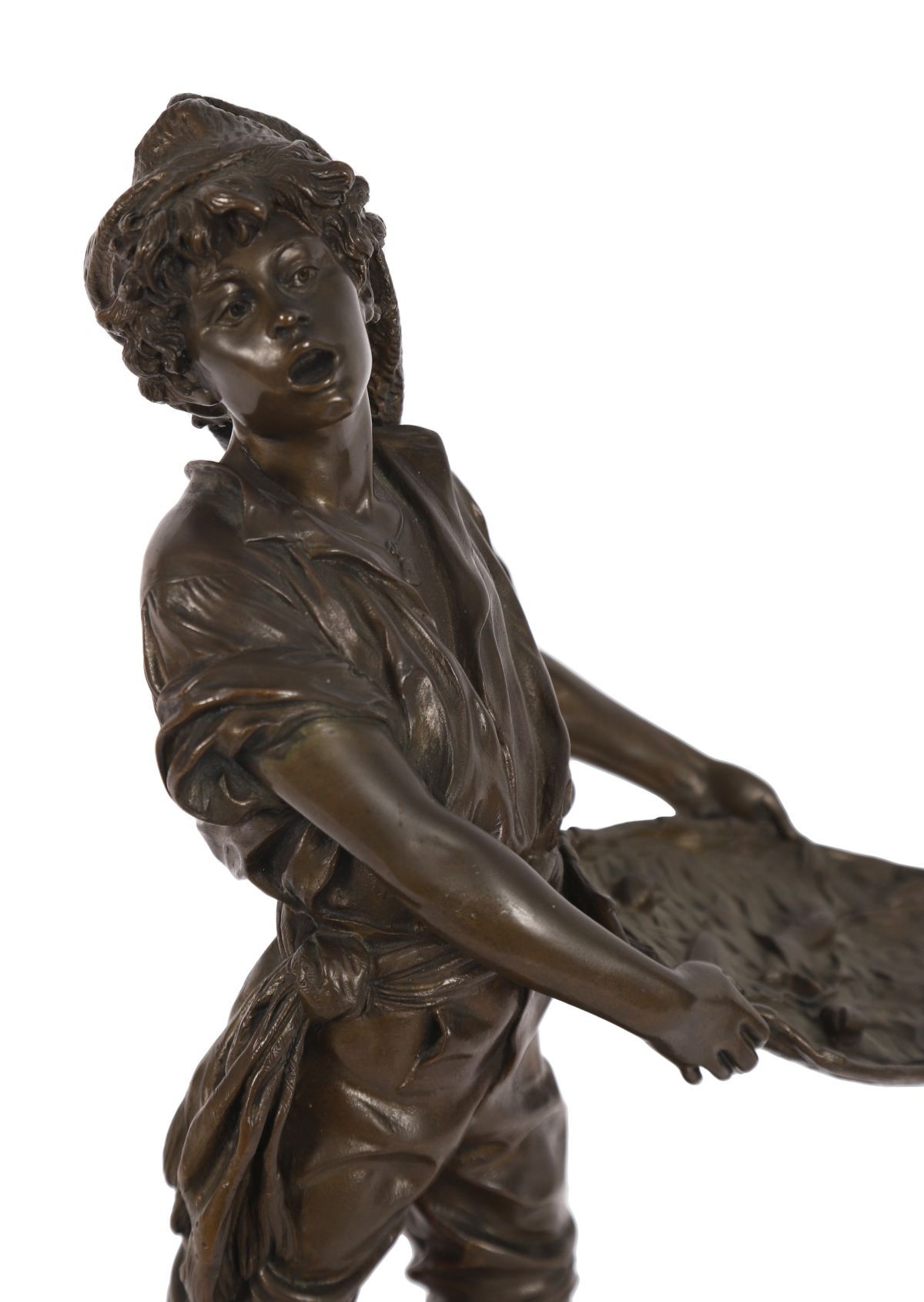 A 19th-century Italian bronze figure of a young boy, modelled in animated pose holding a shallow tray, the figure cast with lively expression and naturalistic anatomical detail, raised on a circular base.