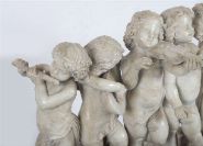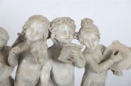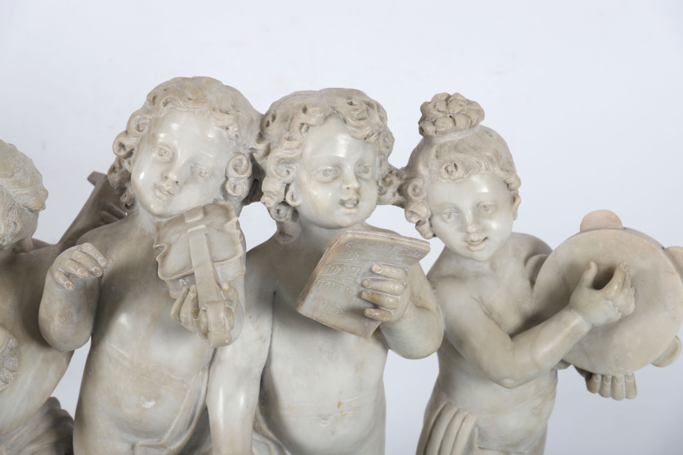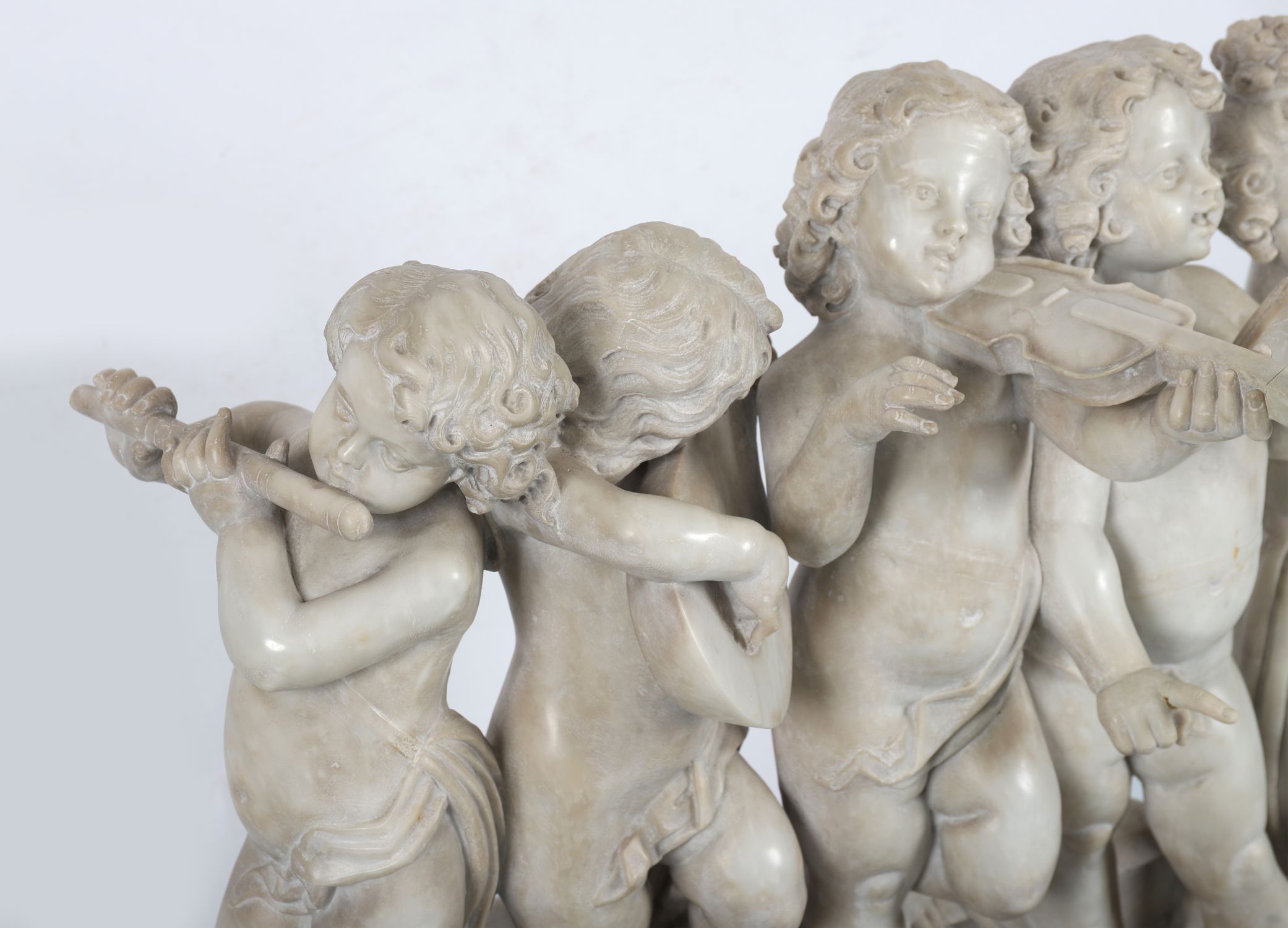A finely carved 19th-century Italian Carrara marble figural group titled Musica, depicting a lively ensemble of five putti playing musical instruments including lute, violin, and tambourine. Executed in high detail with flowing curls, naturalistic drapery, and expressive gestures, the group stands on a shaped rectangular base inscribed MUSICA, adorned with carved roses and floral motifs.