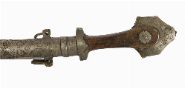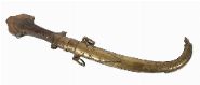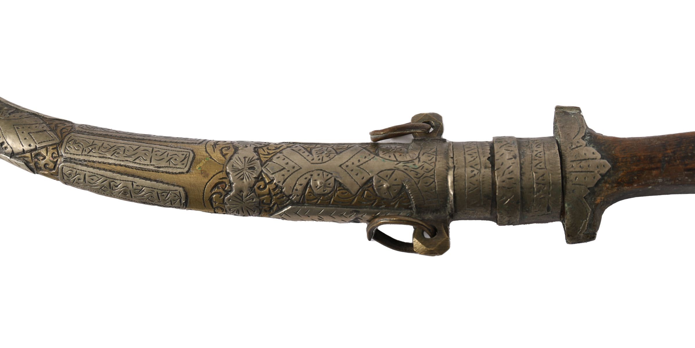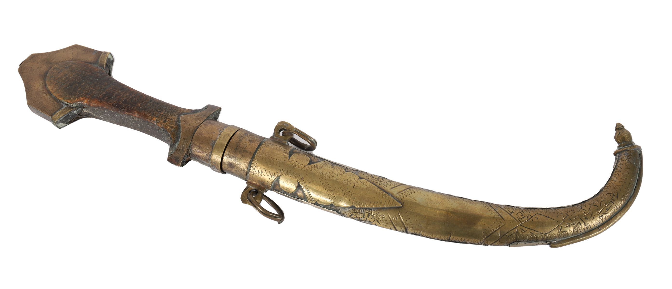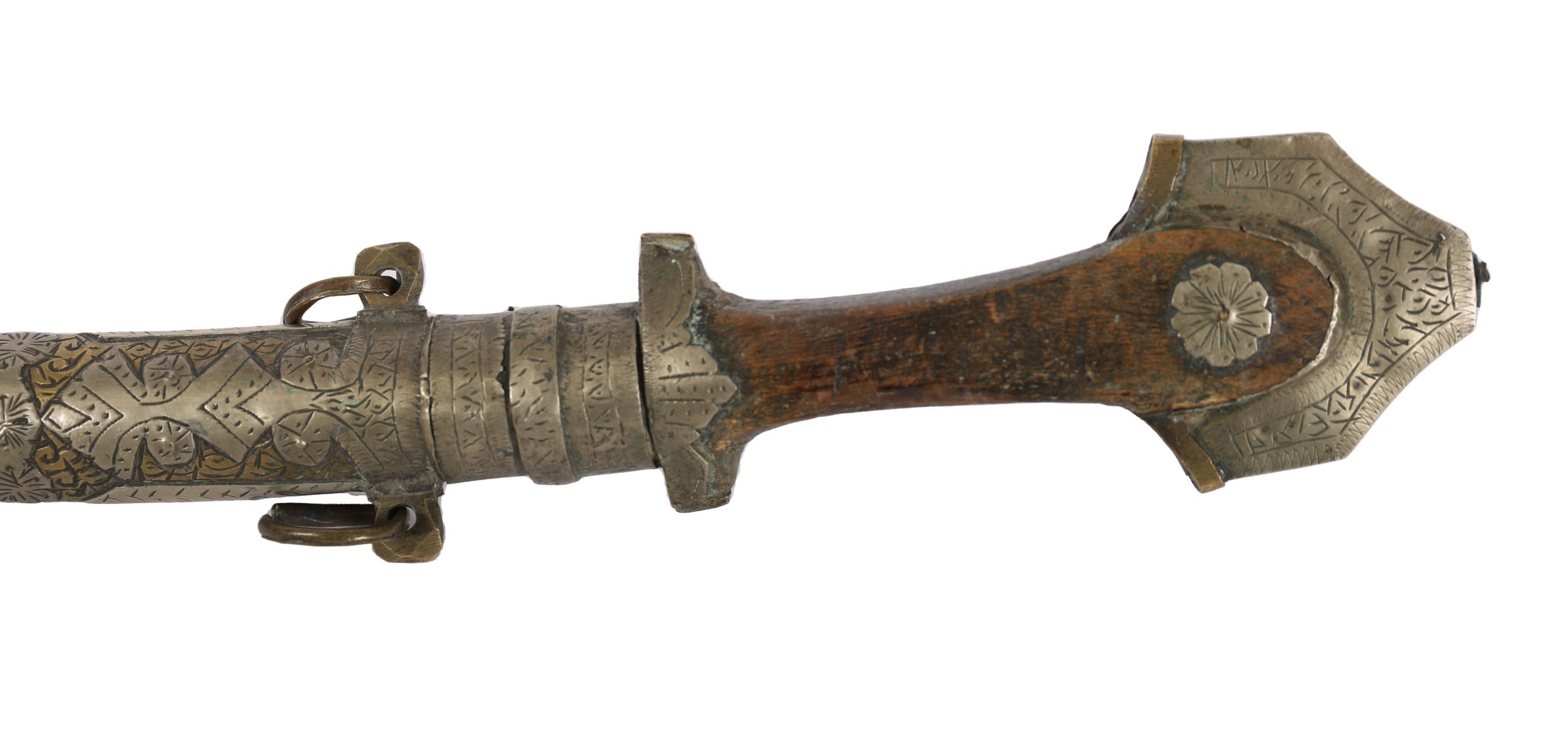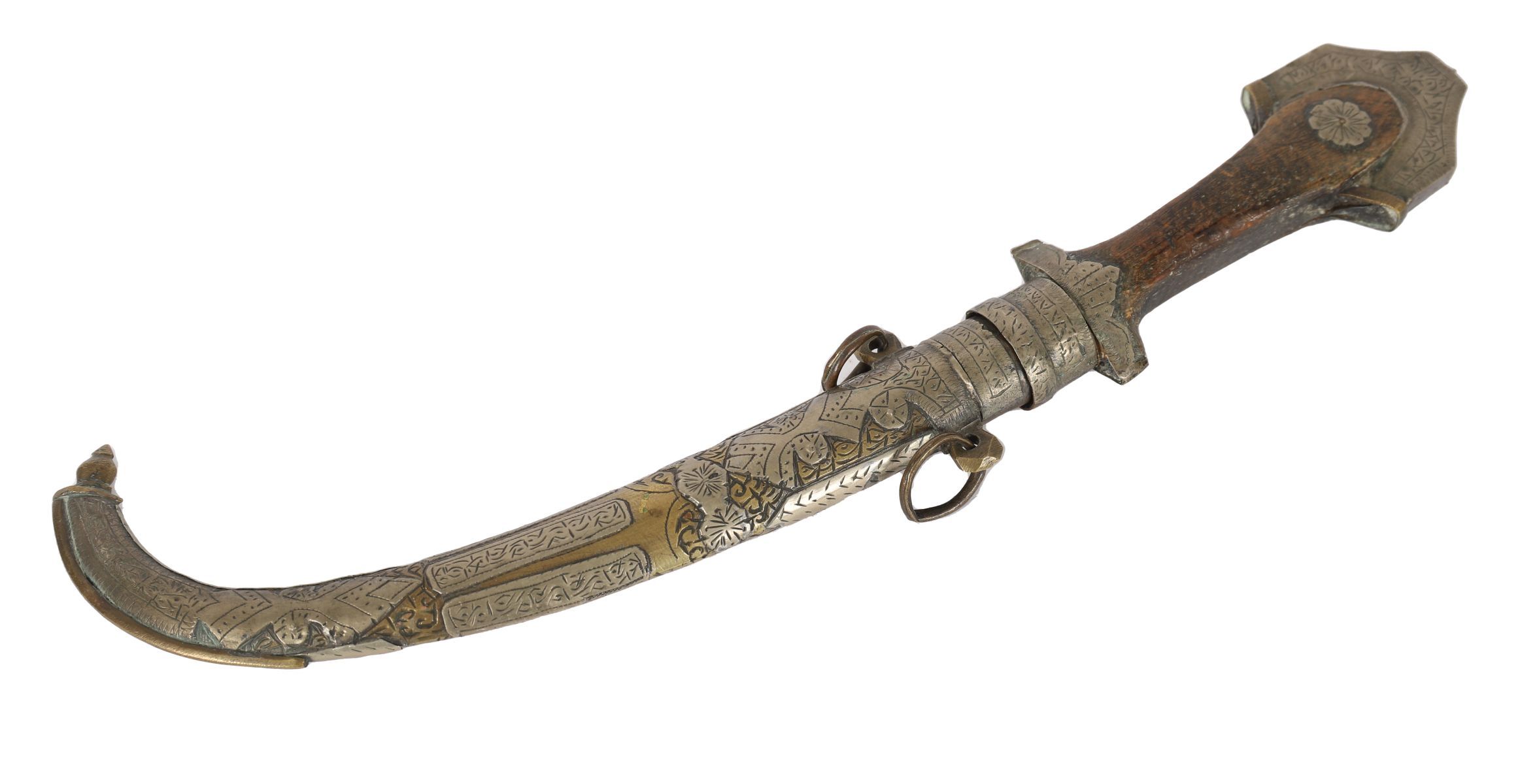 A 19th-century jambiya with curved steel blade, engraved metal hilt, and matching decorated scabbard. Middle Eastern or North African, 19th century.