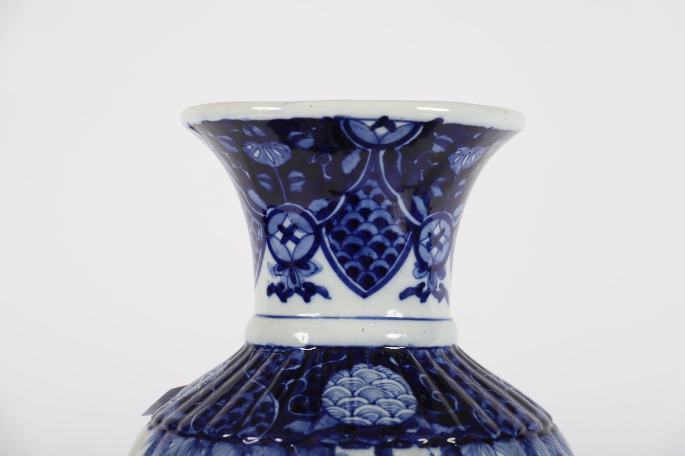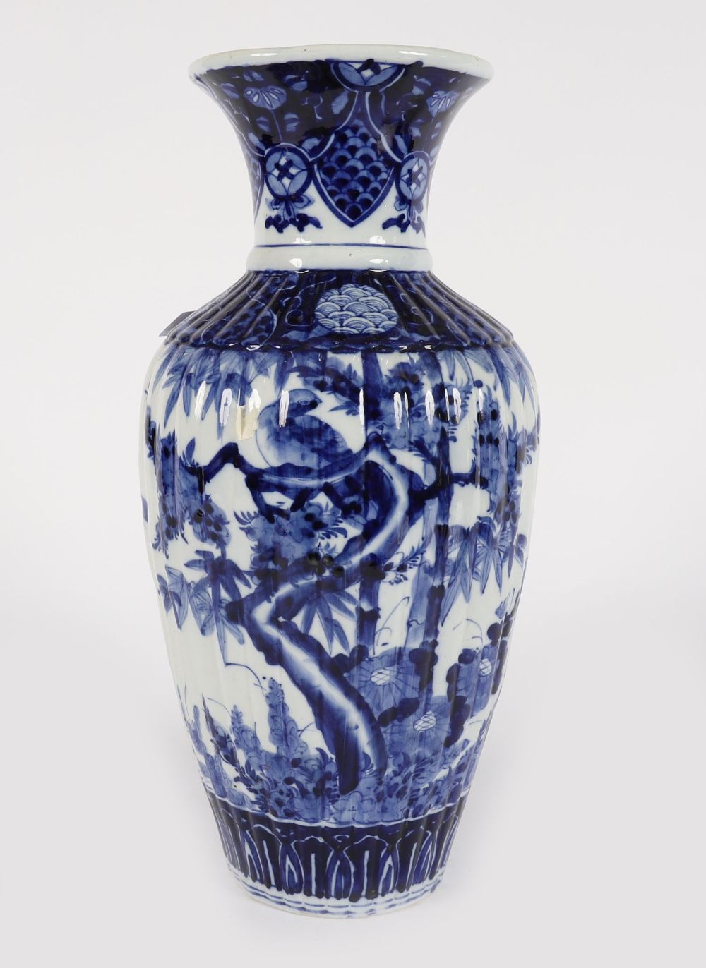 A tall Japanese porcelain vase, late 19th century, decorated in blue and white with foliage, blossoms, and patterned borders. The shoulder features scaled cartouche and lappet detail.