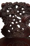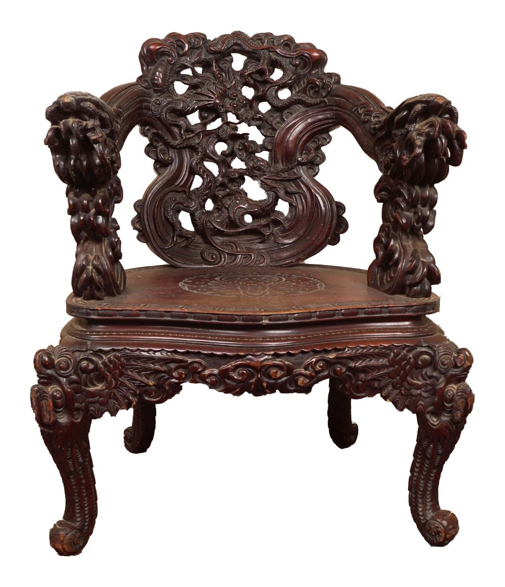 with an open dragon carved back and arms, above a panelled seat, raised on scroll legs to the fore.