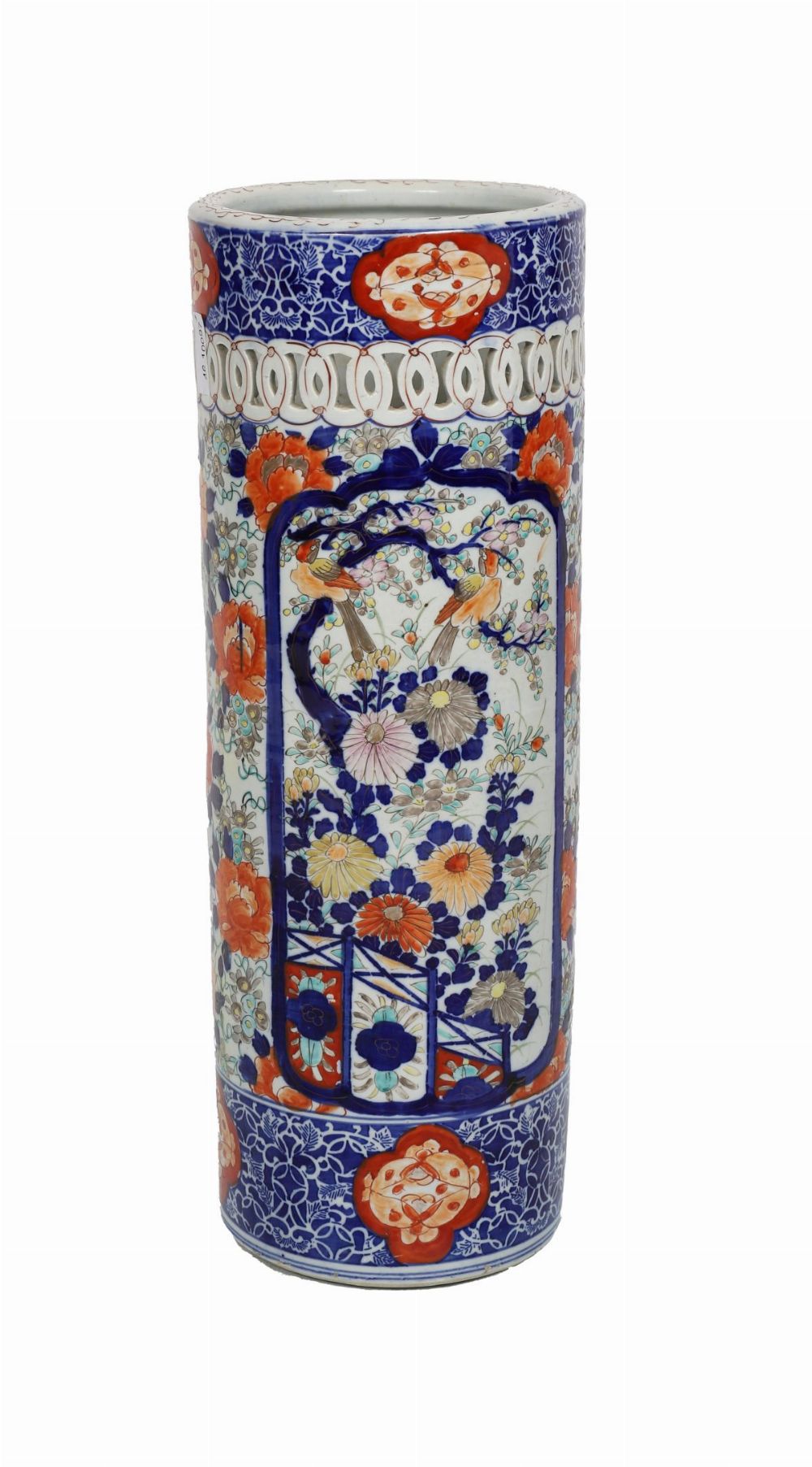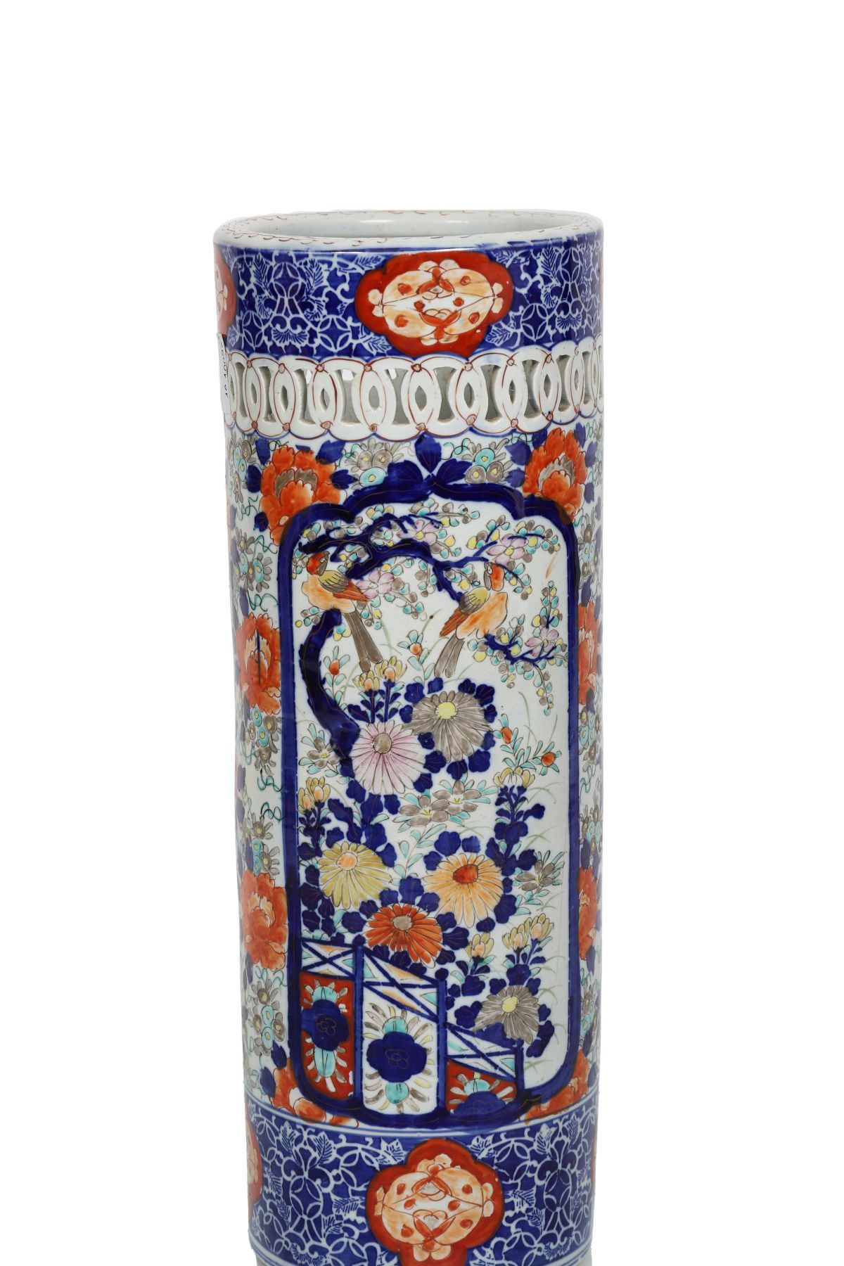 A tall 19th-century Japanese Imari porcelain stick stand, of cylindrical form with pierced upper rim, richly decorated in cobalt blue, iron-red, and gilt with panels of birds among flowering branches.