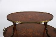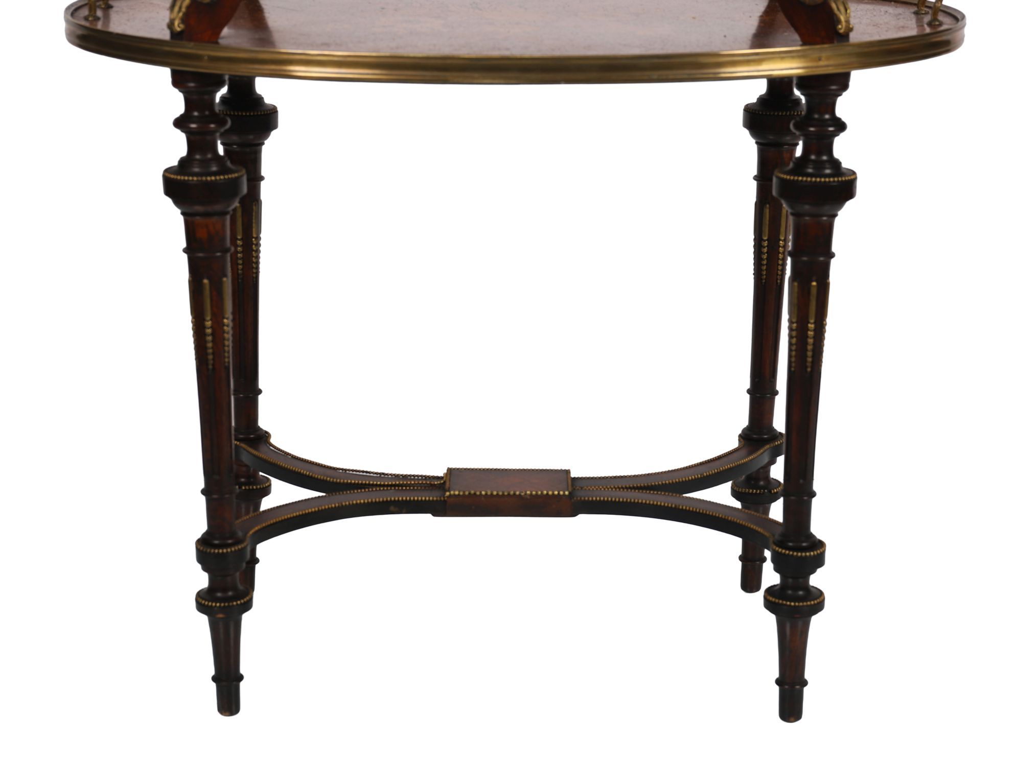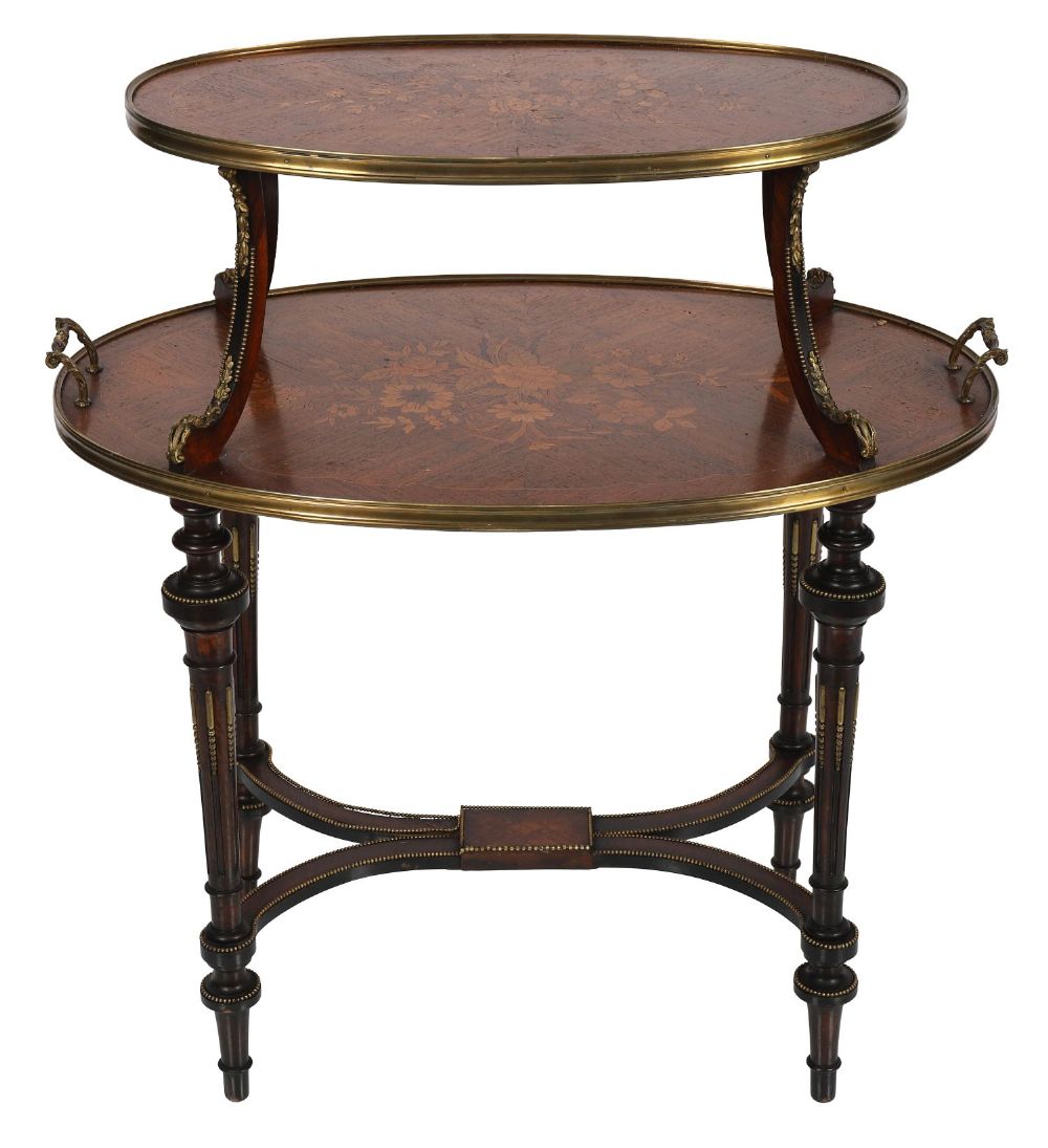 A superb 19th century kingwood two-tier dumbwaiter, the oval tiers inlaid with floral marquetry and crossbanding, enclosed with pierced brass galleries, supported on elegant turned and fluted supports united by an X-stretcher. A refined and decorative piece, well suited to the salon or drawing room.