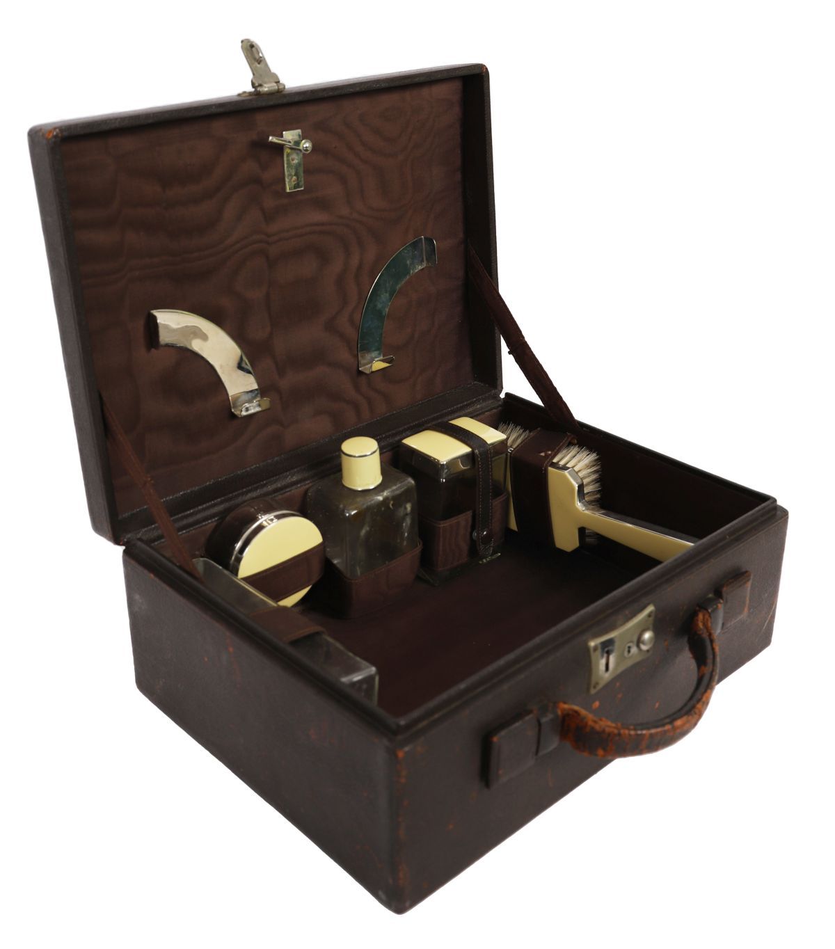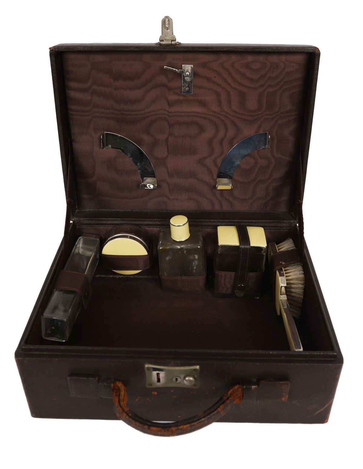 A 19th-century lady’s vanity set, contained within original fitted leather case, the interior fitted with assorted grooming jars and implements.