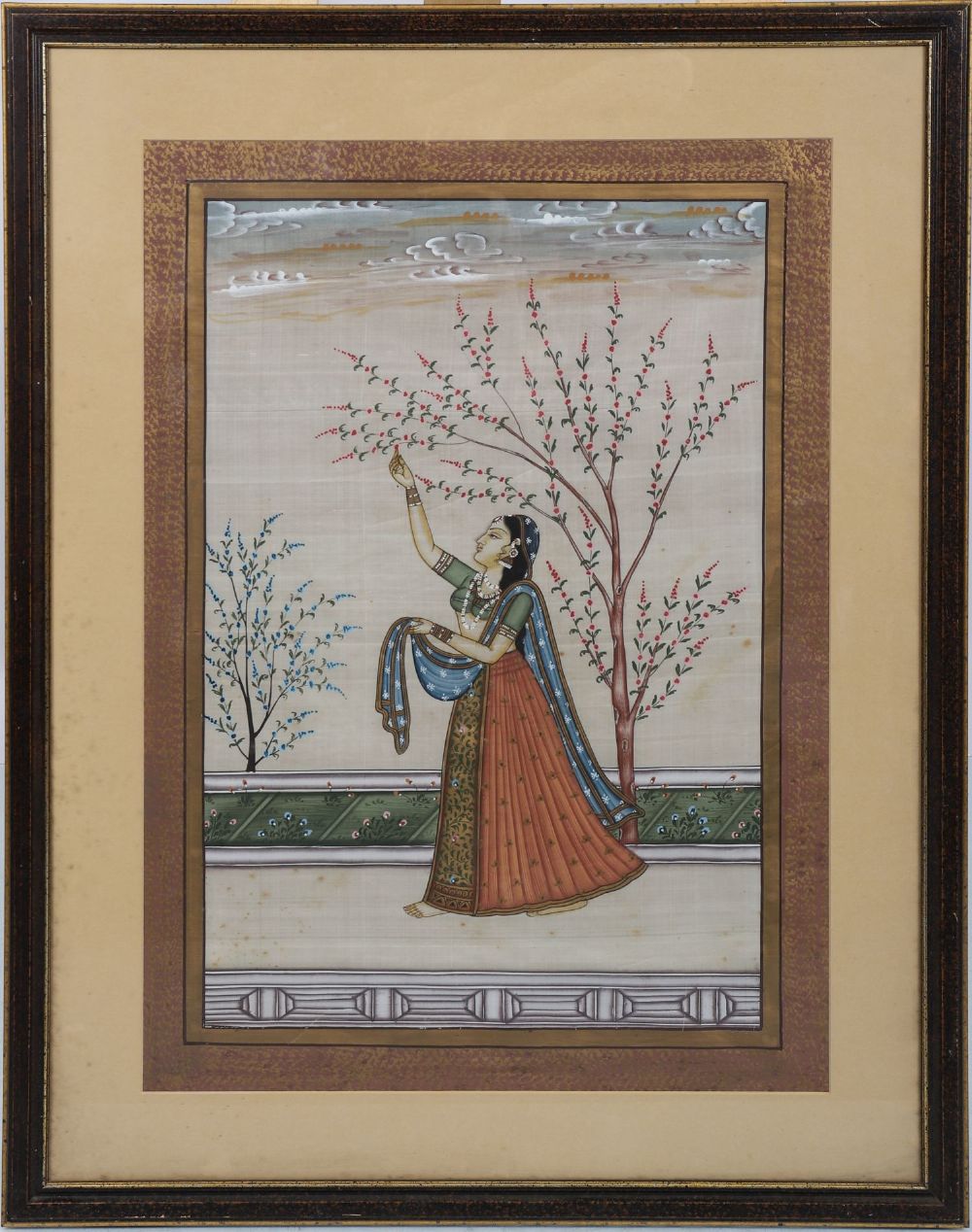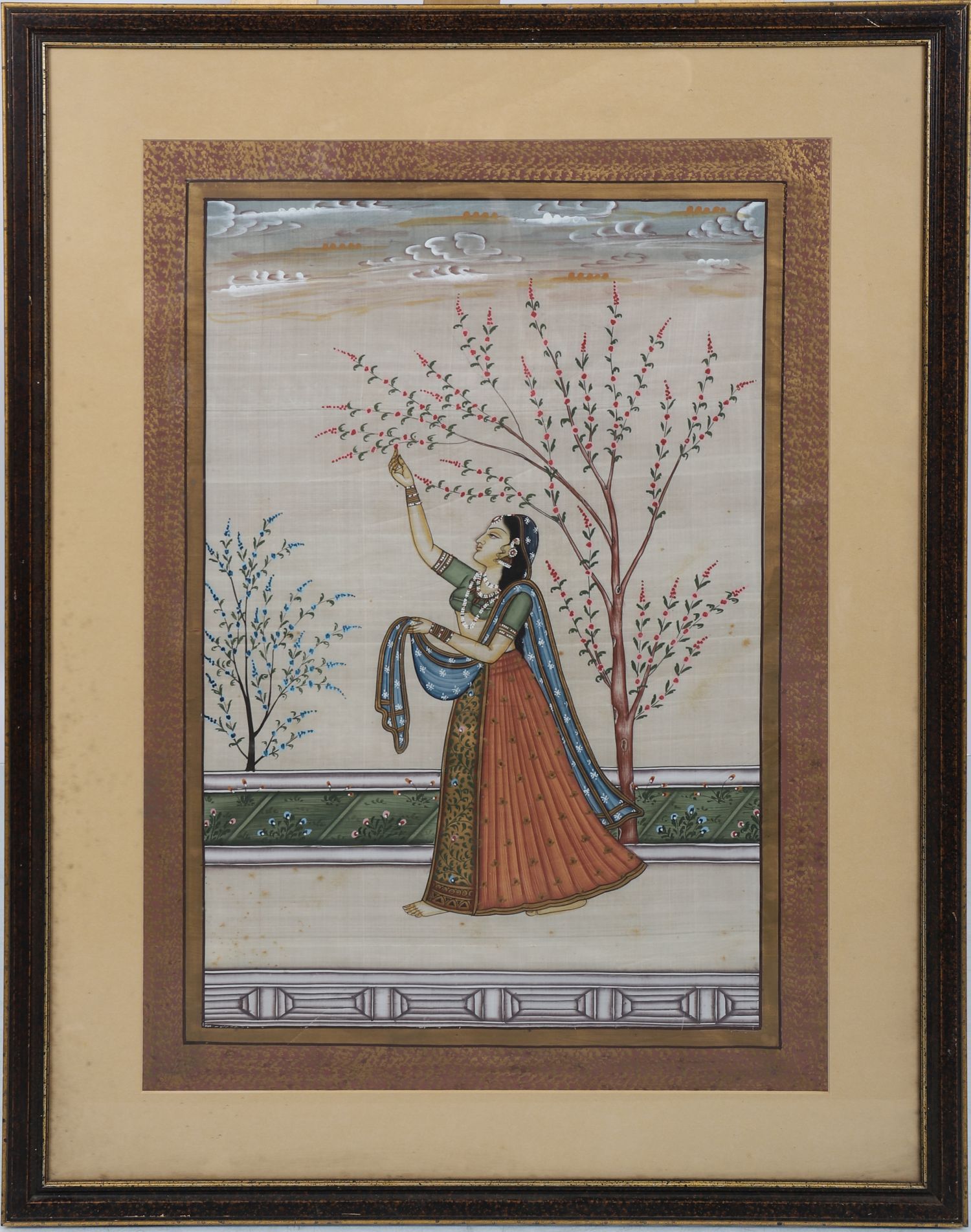 A finely detailed framed Indo-Persian painting on fabric, depicting a female figure in elaborate traditional dress reaching toward the branches of a flowering tree, with a secondary tree to the left and a stylised cloud-filled sky above. Set within a decorative painted border and mounted in a gilt and dark wood frame under glass.
