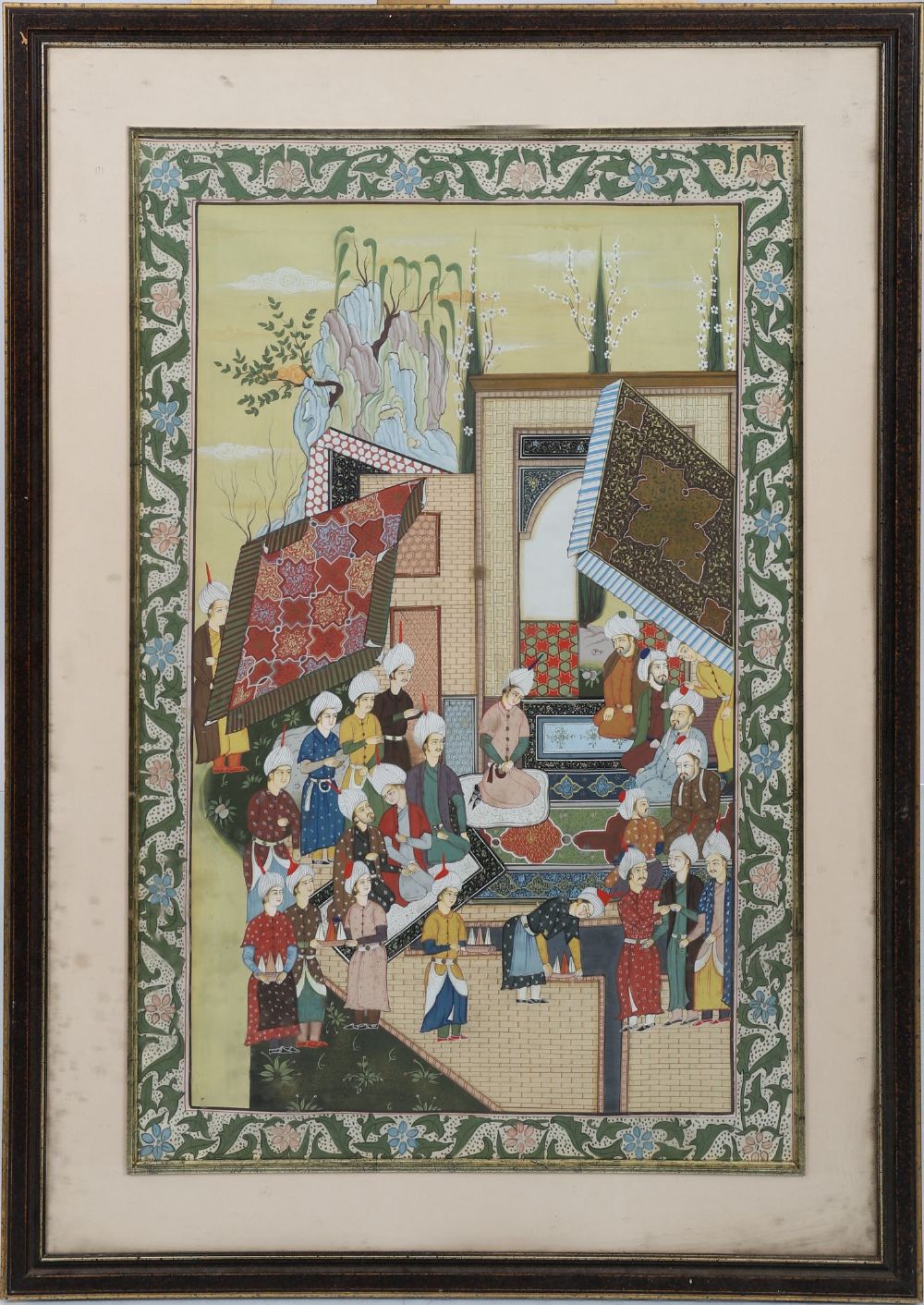 A large, finely executed Indo-Persian painting on paper, depicting an elaborate architectural courtyard scene with numerous turbaned figures engaged in various activities. The composition features richly patterned tiled roofs, floral details, and a decorative green foliate border, all enclosed in a gilt and dark wood frame under glass.