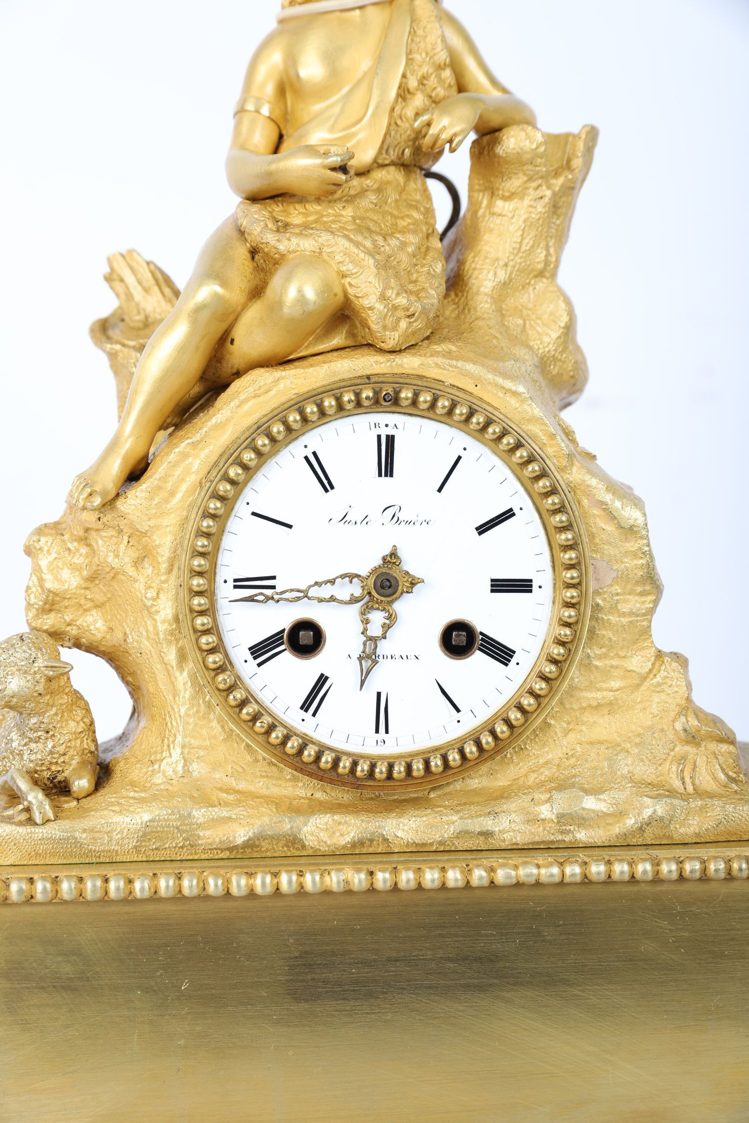 Charming and finely cast, this clock features a seated young boy draped in rustic attire. The enamel dial, signed Juste Bruere, A Bordeaux, is surrounded by a richly detailed, rococo-inspired case. Mounted on a veined marble base.