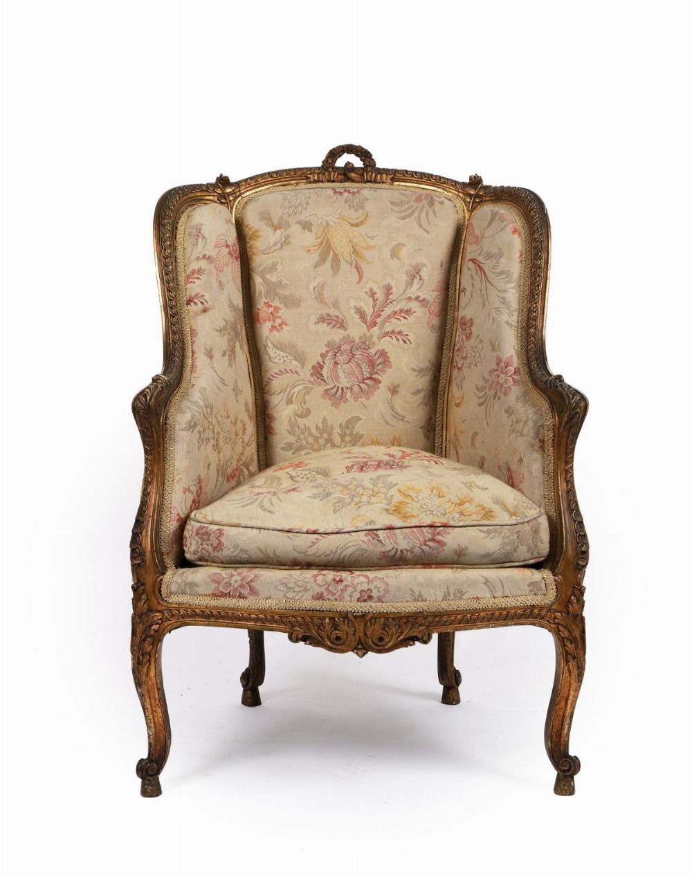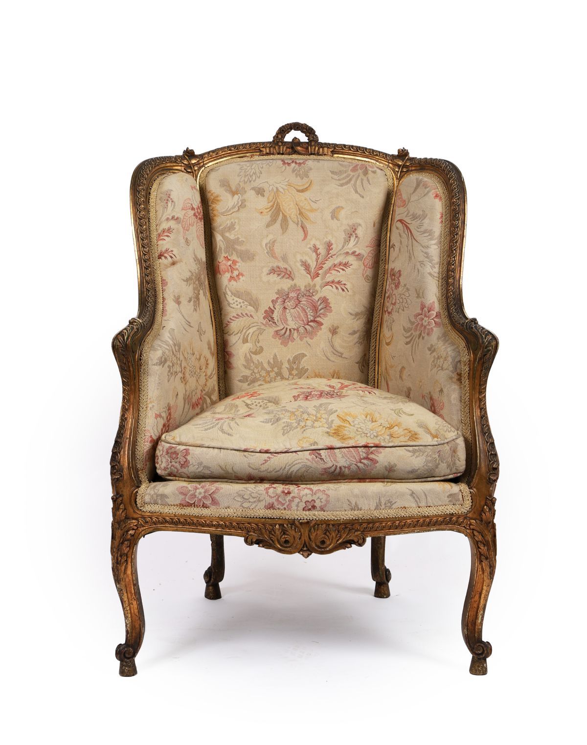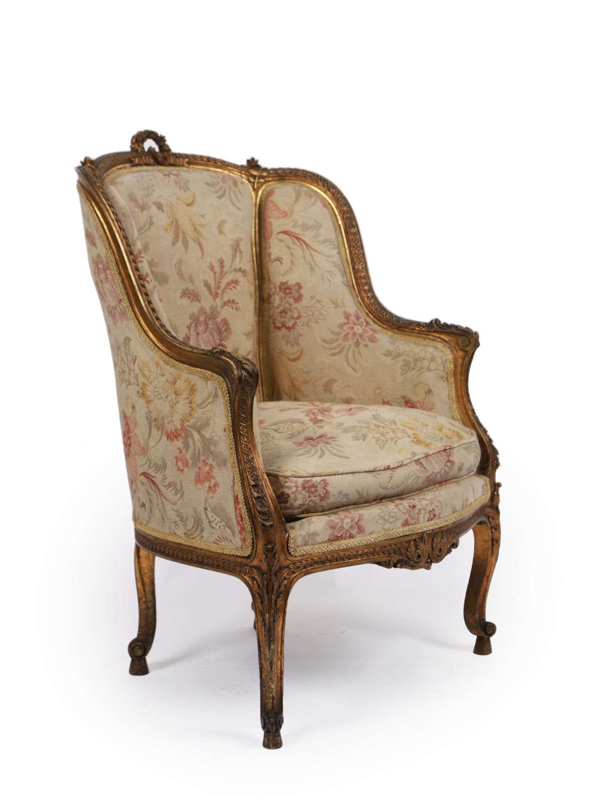 A French giltwood bergère wingback chair in the Louis XVI style, with carved floral and ribbon decoration, upholstered in patterned fabric; attributed to a Pierre Laroque design.
