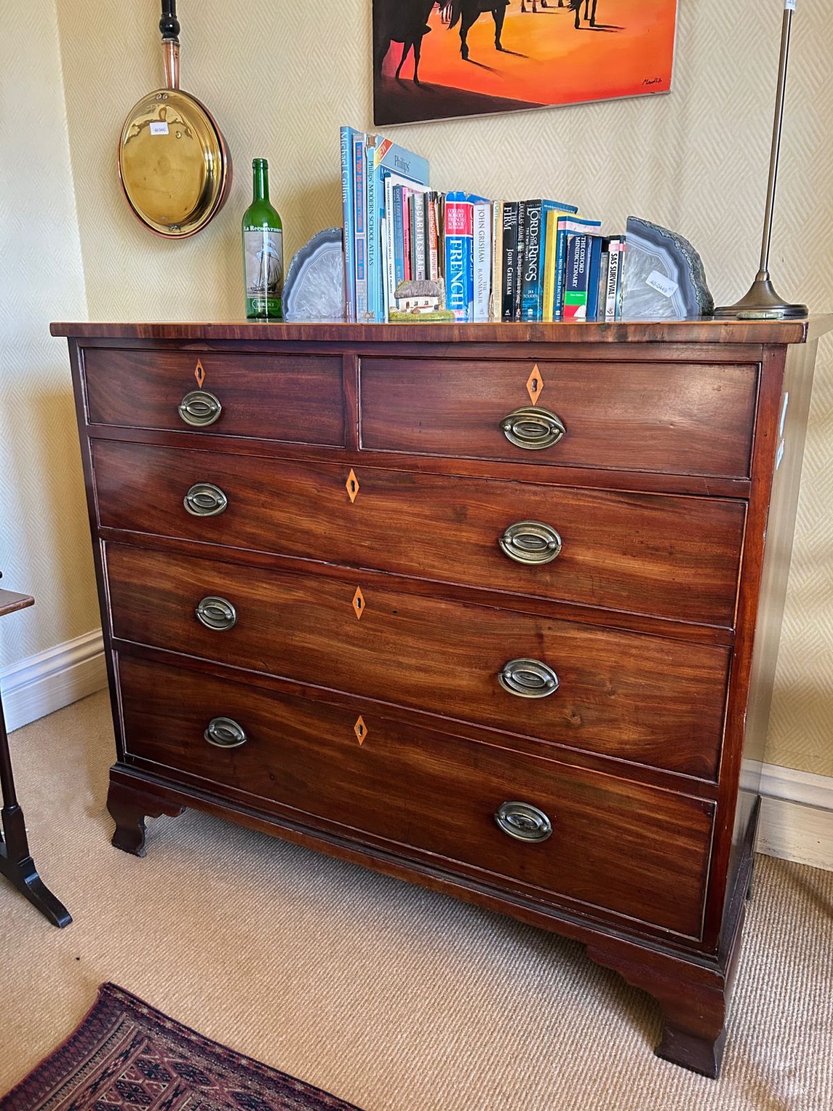 Of 2 short and 3 long drawers furnished with brass handles raised on bracket feet.