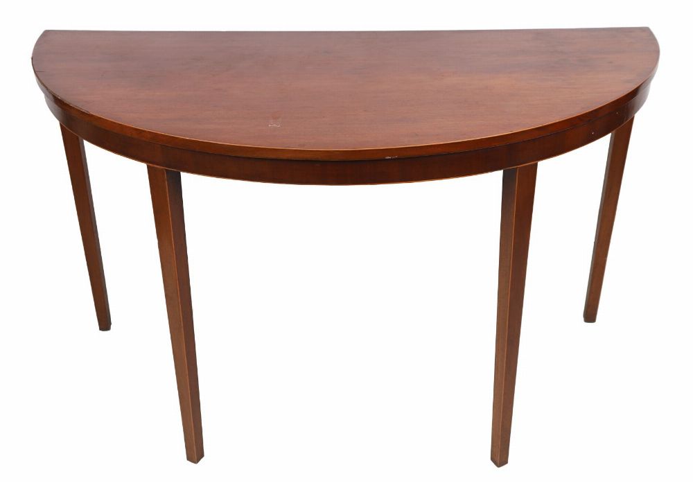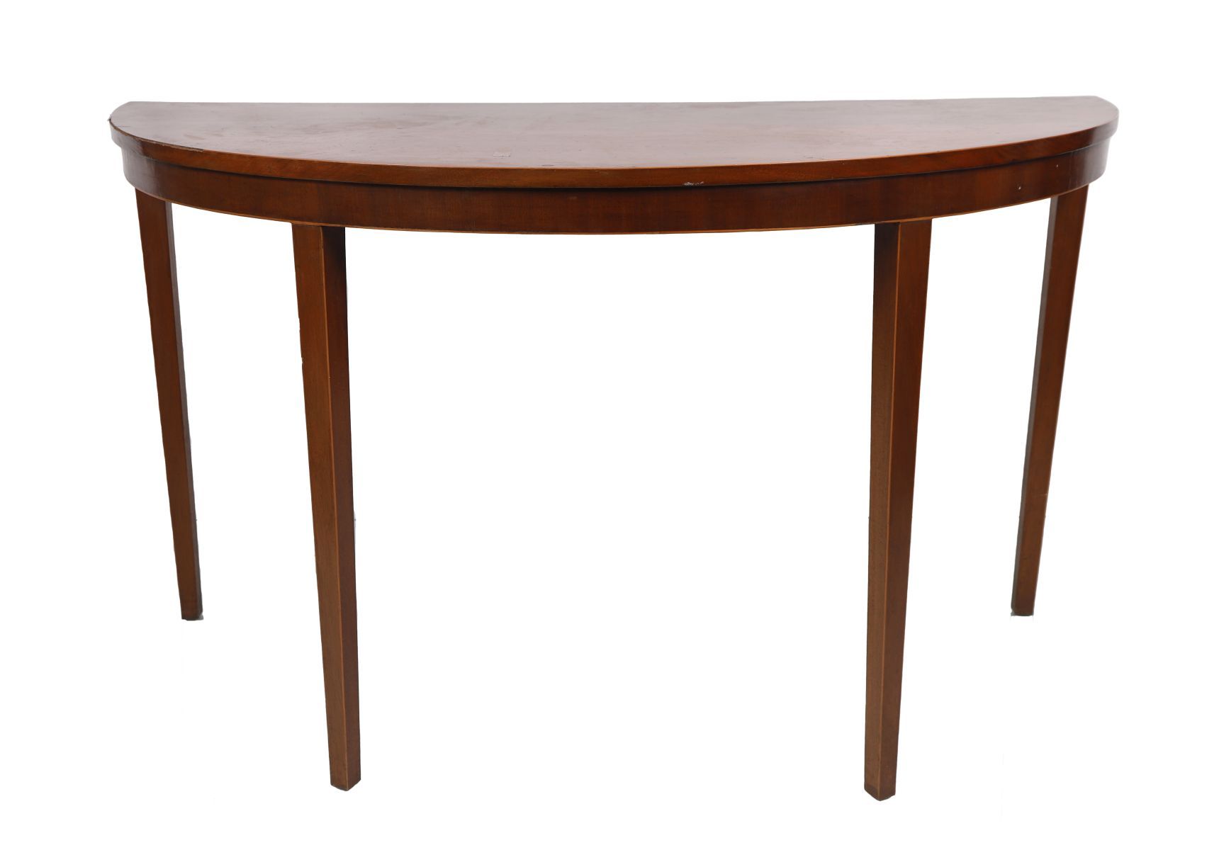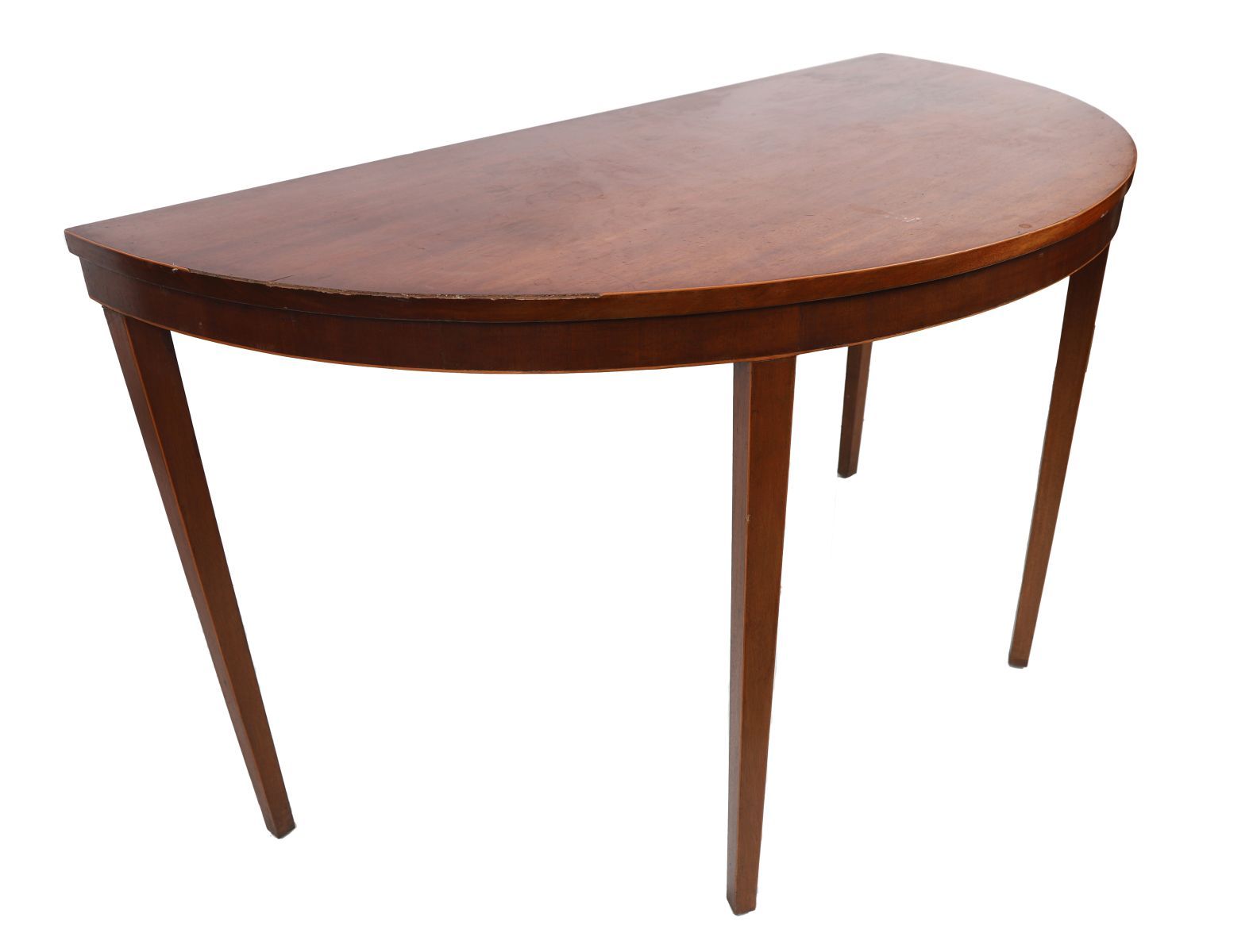 The demilune-shaped top above a conforming frieze, raised on square tapered legs.