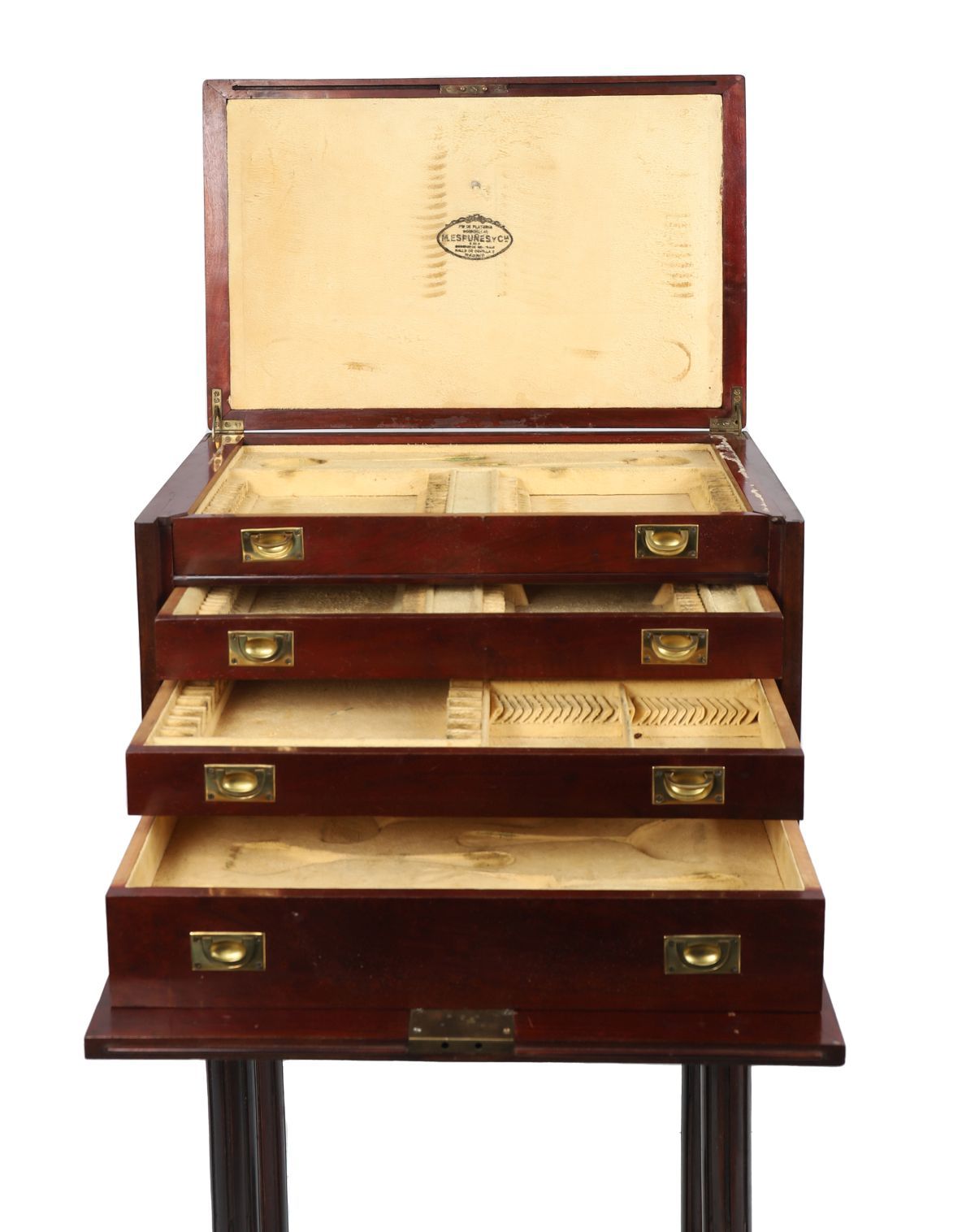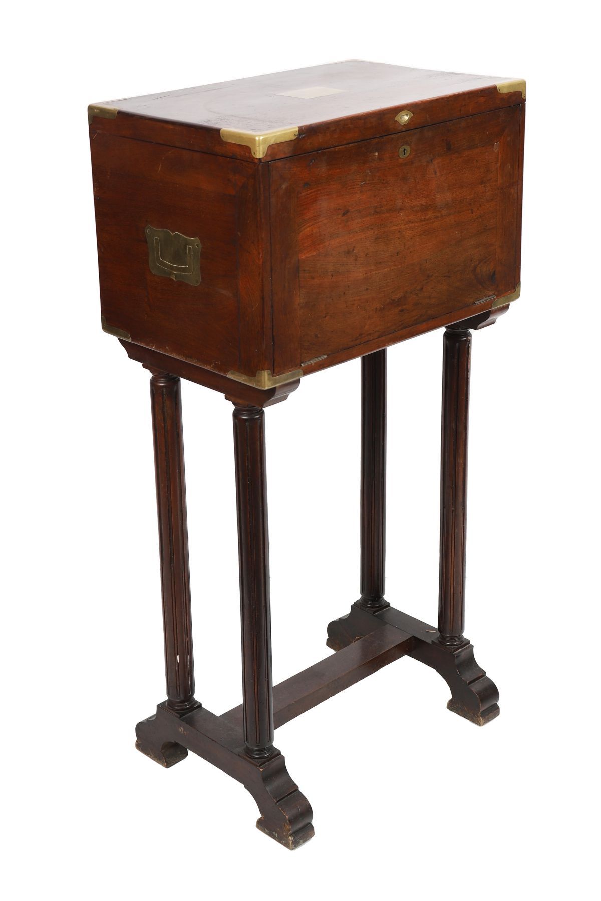 the rectangular-shaped top with inset brass corners opening to a fitted interior above a fall front revealing a series of smaller drawers furnished with sunken brass handles, raised on a turned pillared stand.