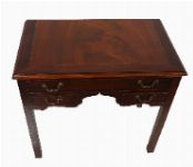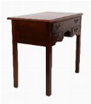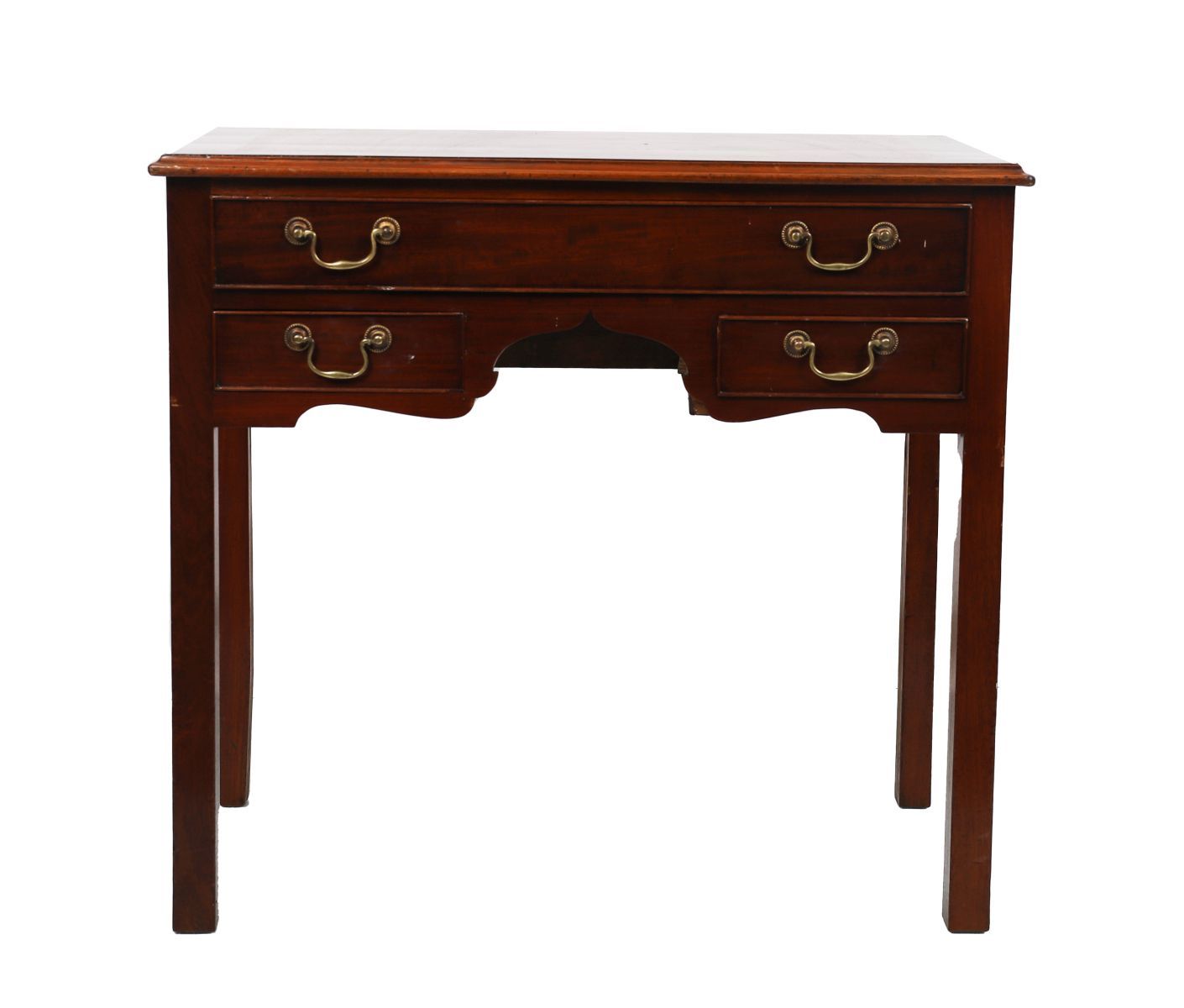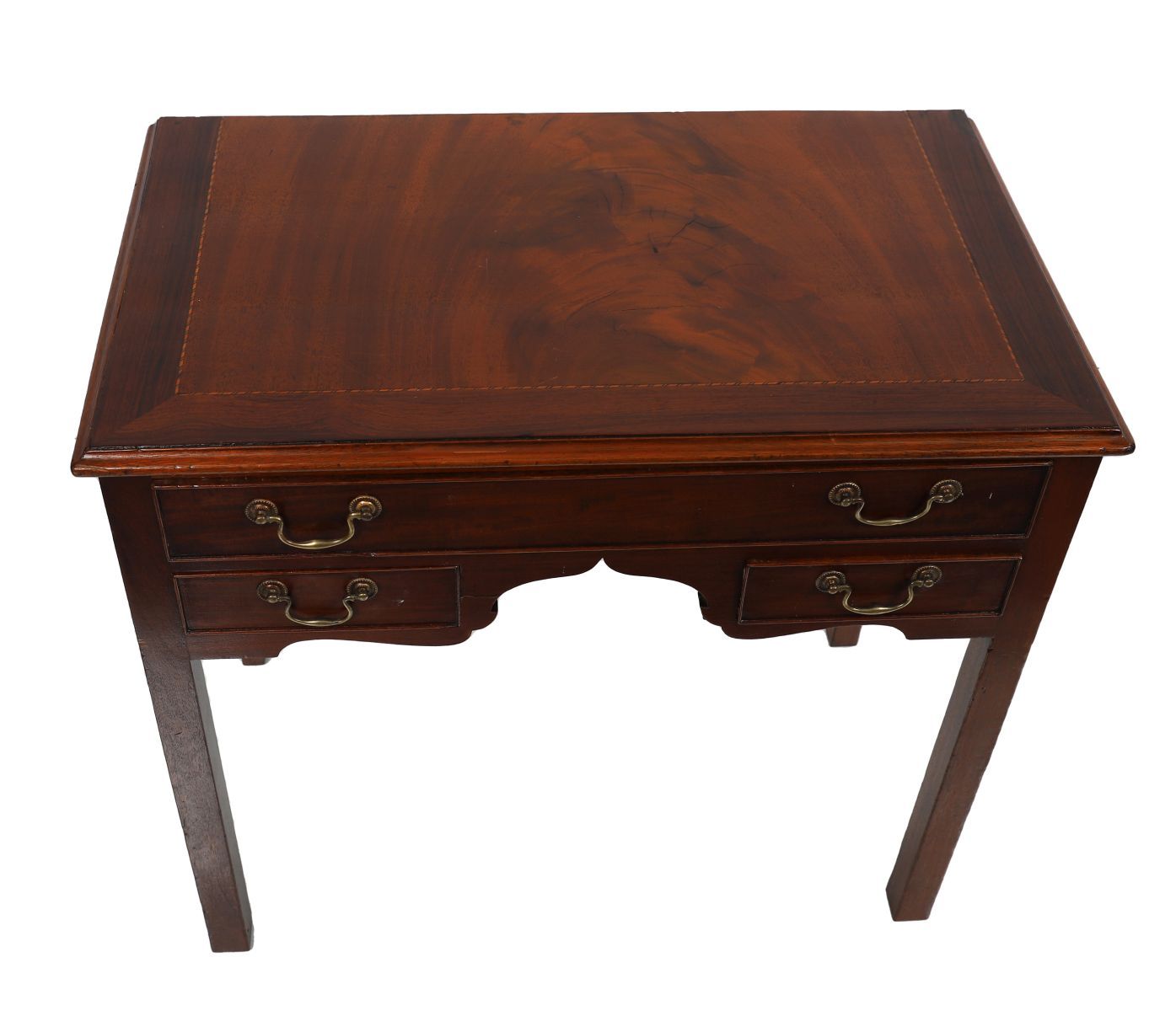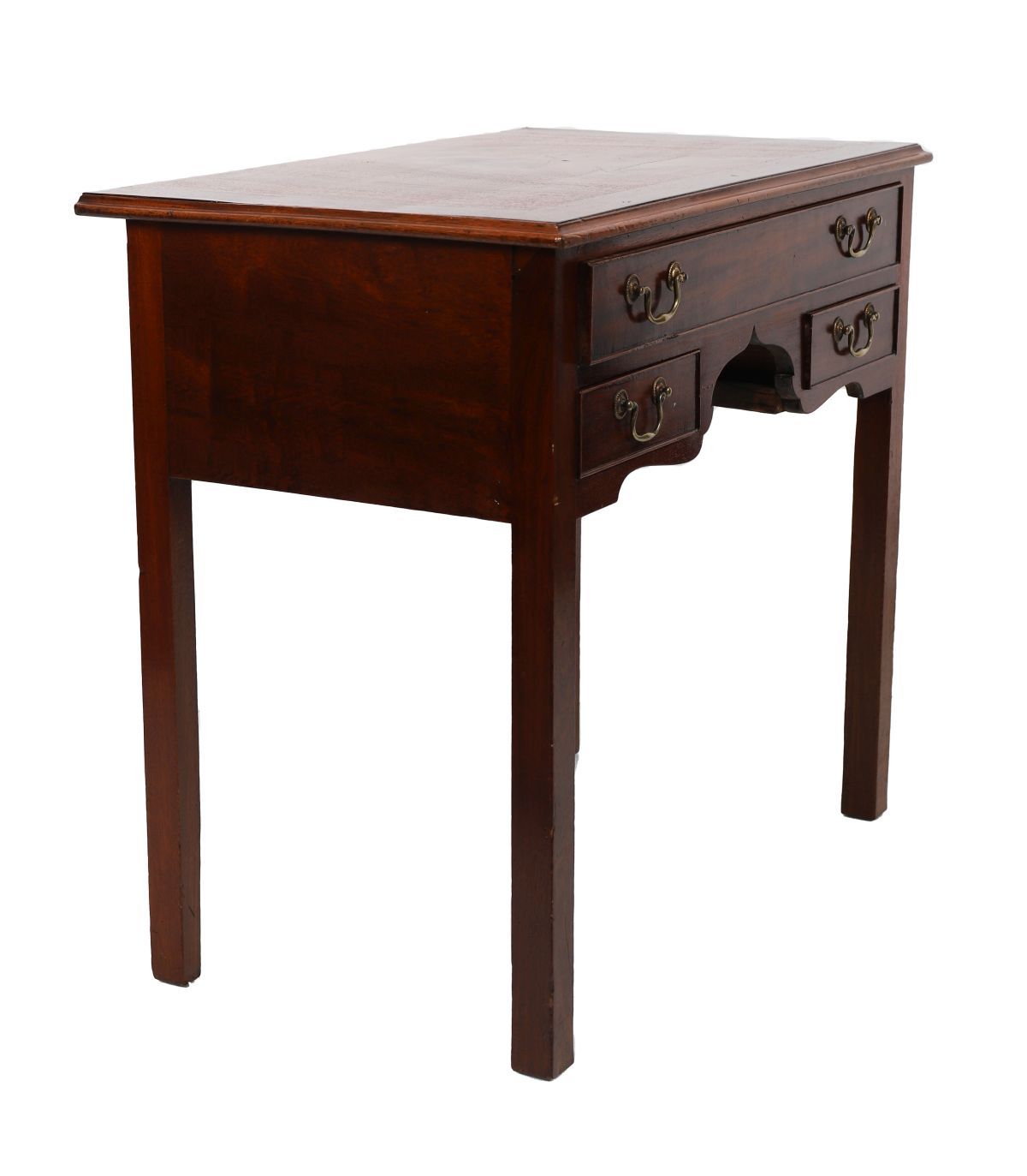A 19th-century mahogany lowboy with crossbanded rectangular top above one long and two short drawers, fitted with brass handles, raised on square tapering legs.
