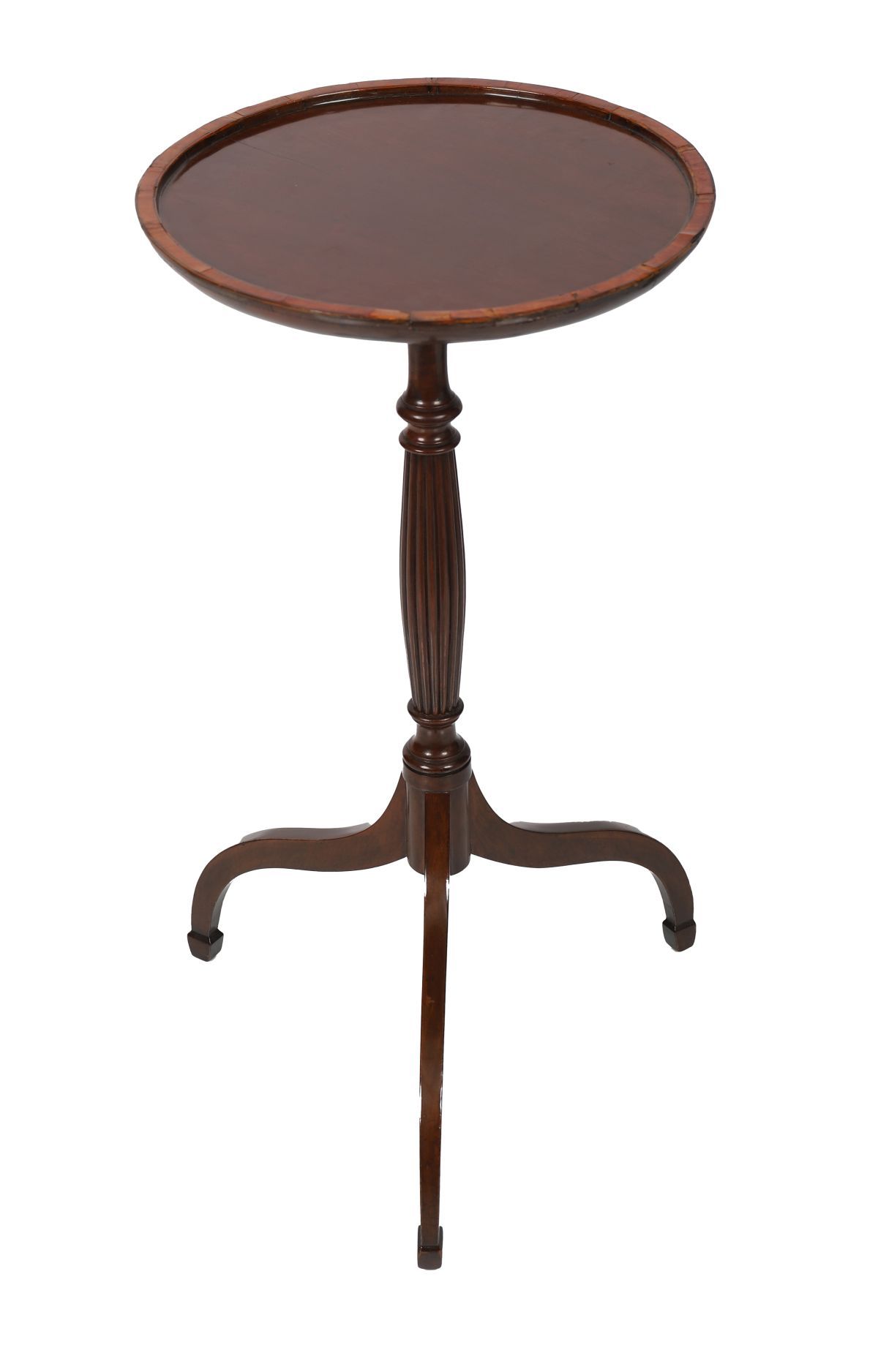 A 19th-century mahogany and fruitwood crossbanded circular wine table, the raised edge top on a reeded and tapering column with tripod base.