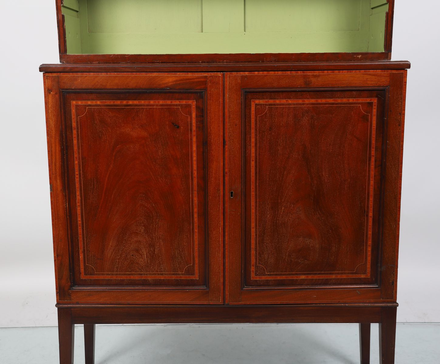 A fine 19th-century mahogany and satinwood inlaid bookcase, the upper section fitted with open adjustable shelves above a moulded cornice, and a projecting lower section with two panelled doors.