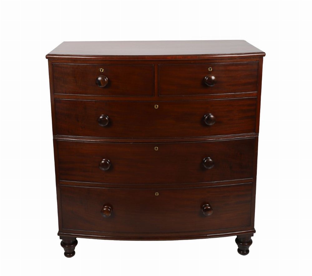 A fine 19th-century mahogany bowfront chest of drawers, fitted with two short and three long drawers, each with turned knob handles and brass escutcheons, raised on short turned feet.