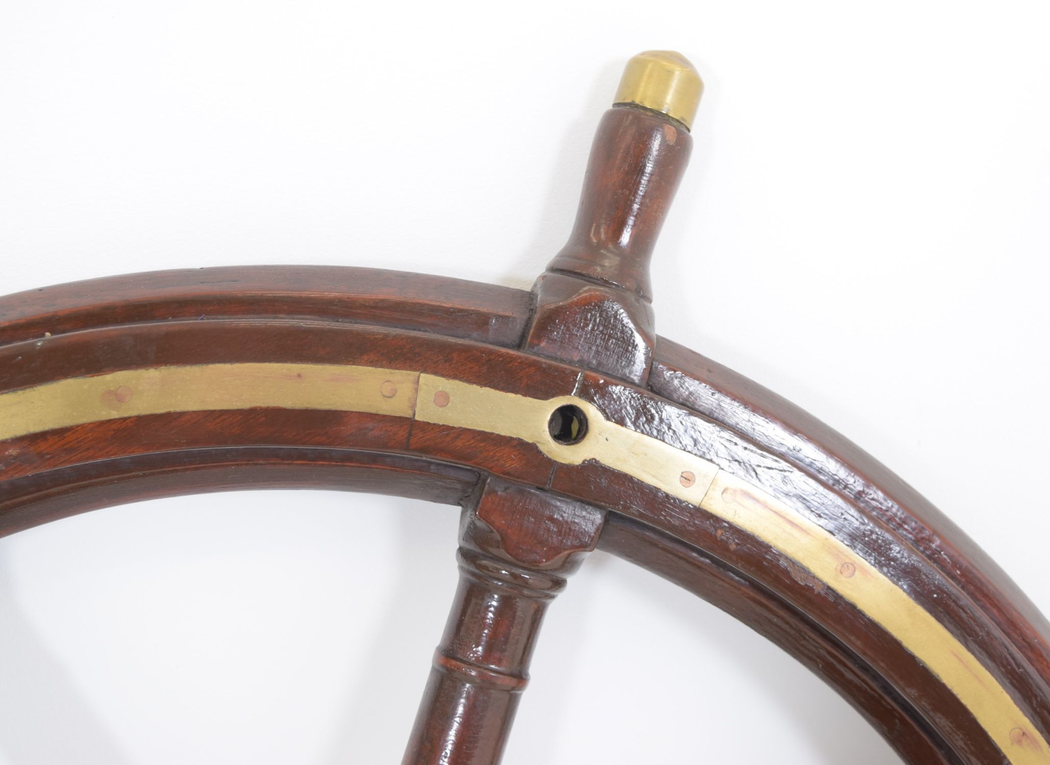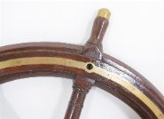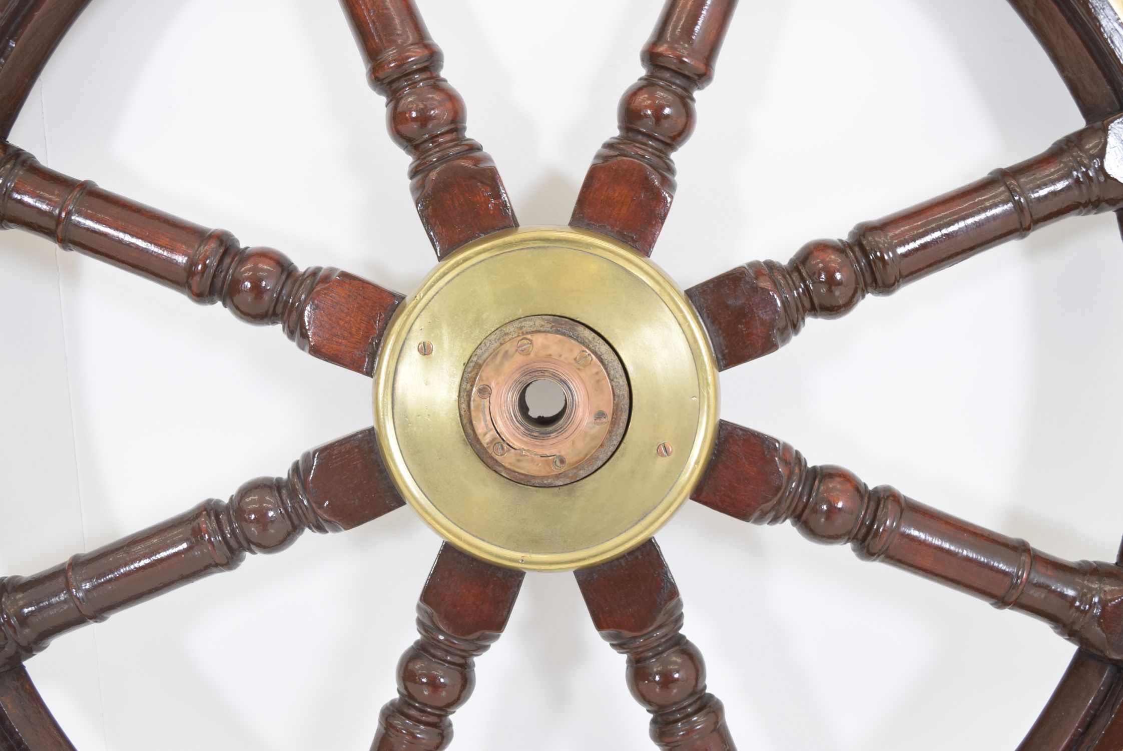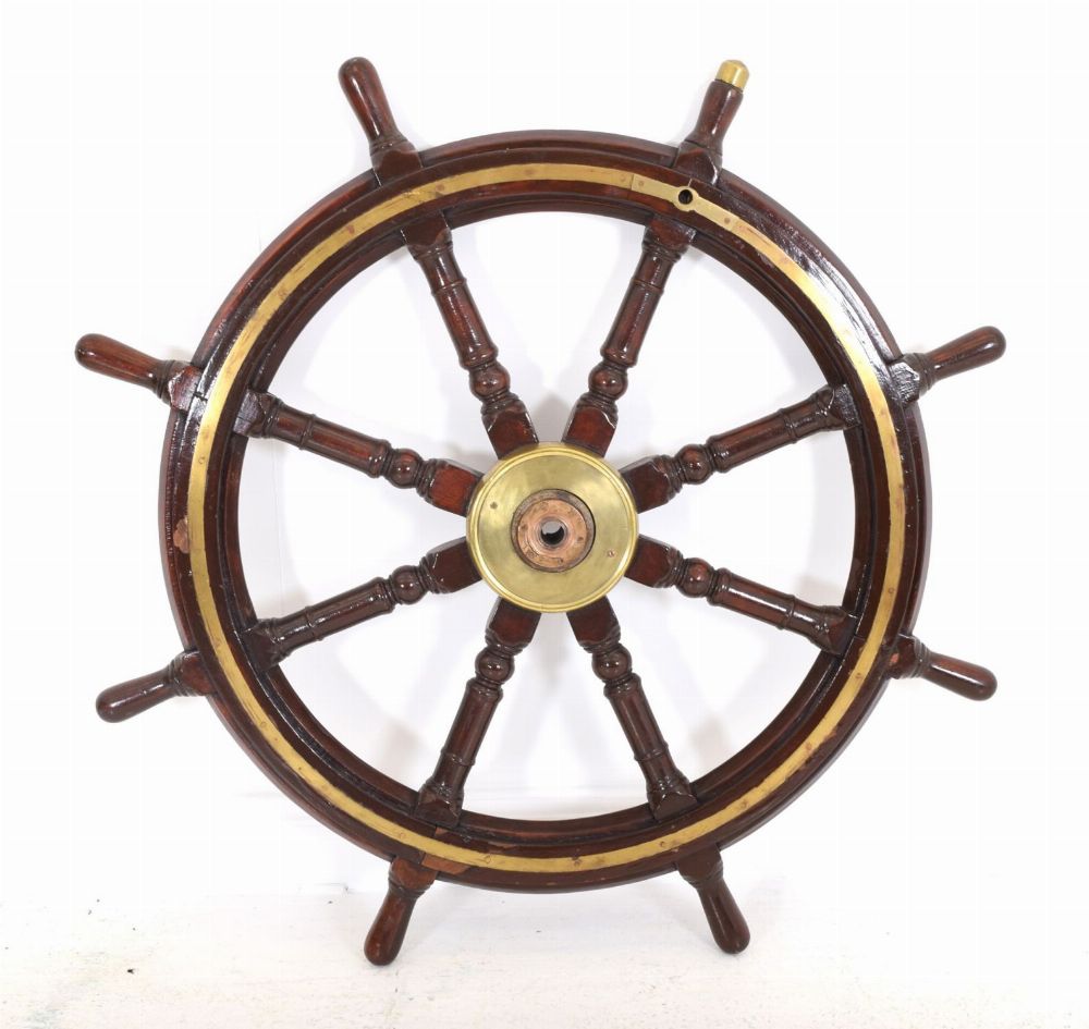 A fine 19th century mahogany ship's wheel, with eight turned handles, brass banded rim, and central brass boss, retaining a rich patina.